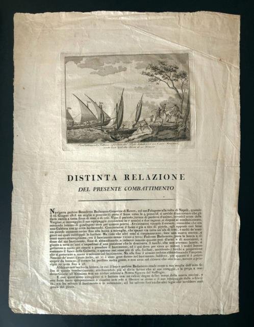 Genova, 1815 circa. Incisione in rame all'acquaforte, cm 18,5 x 25,5 (la parte incisa), cm 42,5 x 56,5 (il foglio). Foglio con alcune pieghe agli angoli superiori ed altre longitudinali e orizzontali (sotto l'inciso) peraltro ben inciso e in buono stato di conservazione. Potrebbe trattarsi di una sorta di "giornale murario" relativo a un episodio della storia di Genova occorso il 18 giugno 1815 e riguardante le scorrerie dei pirati barbareschi nel Mar Tirreno ai primi anni dell'Ottocento. Genova era all'epoca già parte del Regno di Sardegna. Un commerciante genovese, Benedetto Badaracco di Recco, con la sua feluca stava navigando alla volta di Napoli quando, all'altezza di Anzio, fu intercettato da una galera di pirati. Nonostante la sproporzione delle forze e dell'armamento (6 marinai contro 40 pirati), Badaracco scelse di combattere ed ebbe la meglio, prima manovrando in mare e poi con una discesa a terra. Interessante episodio, anche storicamente, perché siamo negli ultimi anni in cui i pirati barbareschi rappresentavano una grave minaccia per le coste italiane e mediterranee in genere. Infatti di lì a poco (1816) l'ammiraglio Lord Exmouth, con la squadra navale britannica, si presentò davanti ad Algeri per ottenere dei trattati che ponessero fine alle scorrerie. La reggenza barbaresca inizialmente rifiutò e la città fu bombardata e costretta ad accettare le condizioni imposte dalla marina inglese, interessata alla tranquillità della navigazione nel Mediterraneo. .