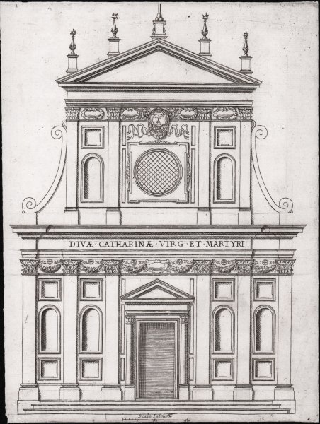 Facciata della ' Chiesa di Santa Caterina dei Funari. Acquaforte, stampata su carta vergata coeva, buone condizioni. Poco si sa di Regnard, se non che fu un incisore francese che trascorse gran parte della sua vita lavorativa a Roma realizzando belle incisioni dei magnifici edifici e delle antichità. Quest'opera di Regnard fu pubblicata a Roma da Francois Collignon nel 1650, senza titolo, ma in un insieme noto come ' Praecipua urbis templa. Le tavole mostrano prospetti, sezioni e piante di chiese romane del XVI e XVII secolo, con didascalie che le identificano e i loro architetti (con occasionali attribuzioni errate). Includono lavori di Carlo Maderno, G. della Porta, F. da Volterra, la famiglia Longhi, G.B. Soria e molti altri. Rara. Chiesa di Santa Caterina dei Funari. Etching, printed on contemporary laid paper, good condition. Little is known about Regnard, except that he was a French engraver who spent much of his working life in Rome making fine engravings of the magnificent buildings and antiquities. This work by Regnard was published in Rome by Francois Collignon in 1650, without a title, but in a set known as ' Praecipua urbis templa. The plates show elevations, sections and plans of 16th- and 17th-century Roman churches, with captions identifying them and their architects (with occasional misattributions). They include work by Carlo Maderno, G. della Porta, F. da Volterra, the Longhi family, G.B. Soria and many others. Rare. Cfr.