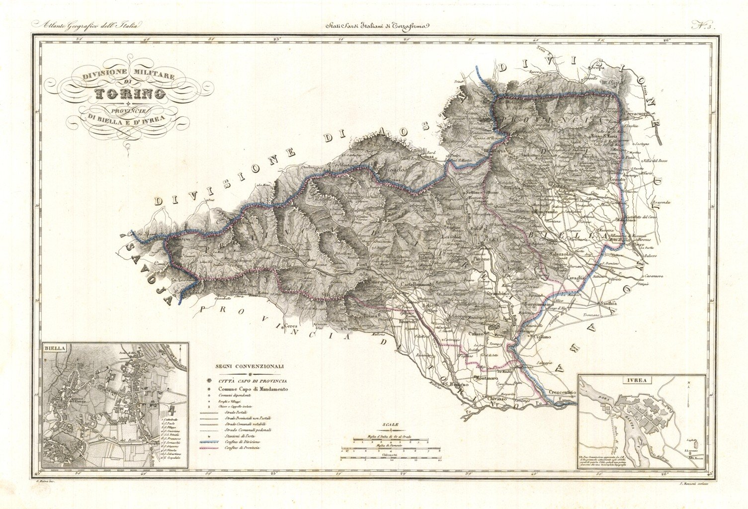 Carta geografica, antica ed originale, con rappresentazione della Divisione Militare di Torino con evidenziati i territori nei dintorni di Pont, Cuorgne, Castellammonte, Rivarolo, Aglié, Caluso, Andorno, Bioglio, Biella, Mongrando, Saluzzola, Azeglio, Strambino. In basso agli angoli, entro riquadri, le piantine delle cittine di Biella ed Ivrea. Inserita nel I volume dell'opera "Atlante Geografico degli Stati Italiani delineato sopra le migliori e più moderne mappe per servire di corredo alla Corografia Fisica Storica e Statistica dell'Italia" contenente le carte dell'Italia Superiore. Descritta da Attilio Zuccagni-Orlandini, edita e stampata a Firenze nel 1844-45. Autore: Zuccagni - Orlandini edit. & G. Maina inc. Luogo: Biella-Ivrea. Anno: 1844. Tecnica: incisione in rame. Dimensioni: 336x522 mm. L'incisione è caratterizzata da una coloritura coeva ai confini