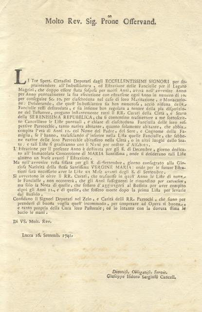 Documento a stampa della Serenissima Repubblica in merito alla "Imbussilatura, ed Estrazione delle Fanciulle per il Legato Magrini". Lucca, 16 settembre 1741.