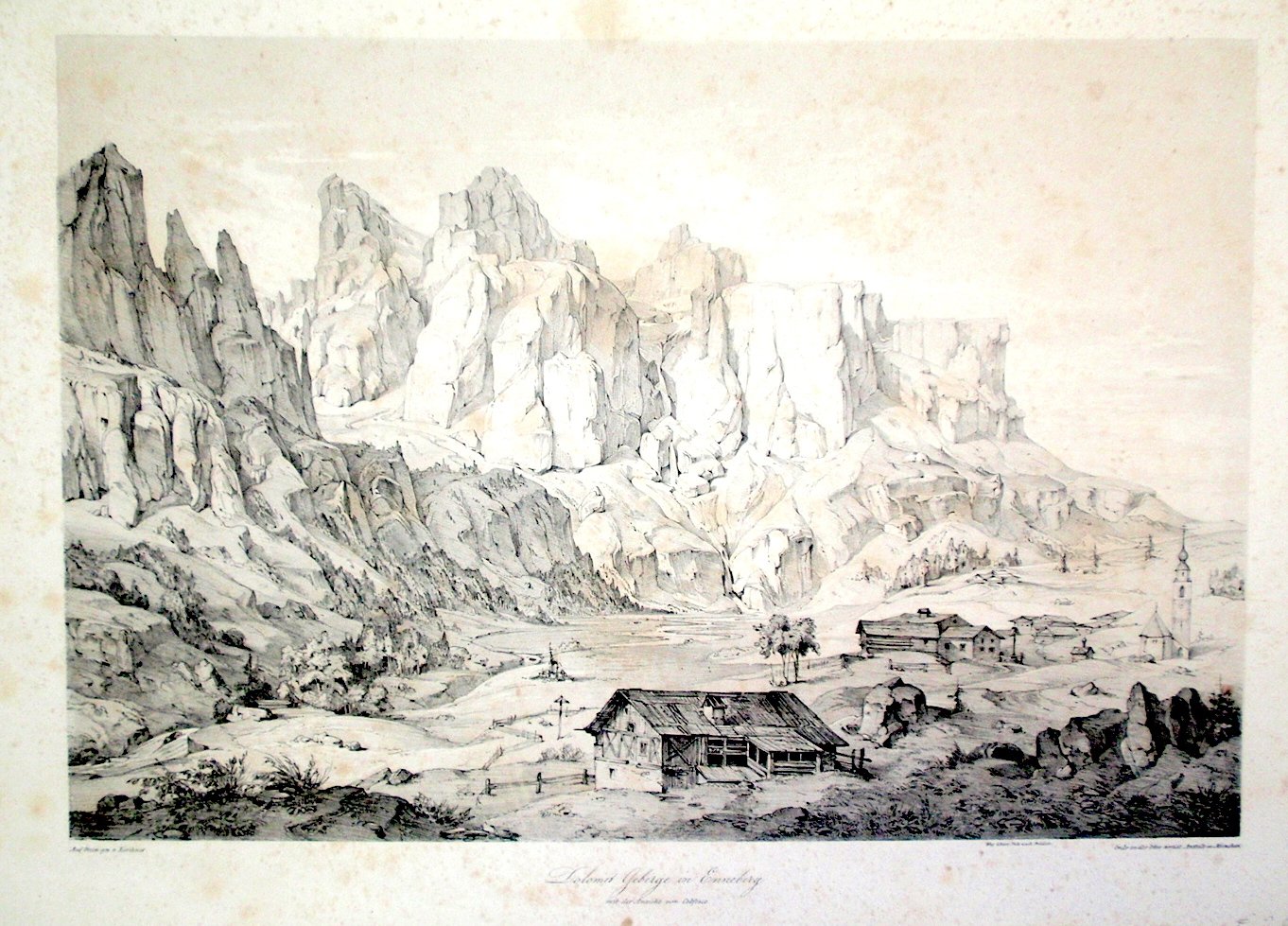 Litografia di mm 300x440 tratta da "Ansichten von Tyrol und Salzburg" (1838-41). Molto rara e fascinosa veduta del gruppo del Sella visto dal Colfosco in Val Badia. <BR>Bell'esemplare con leggere fioriture.
