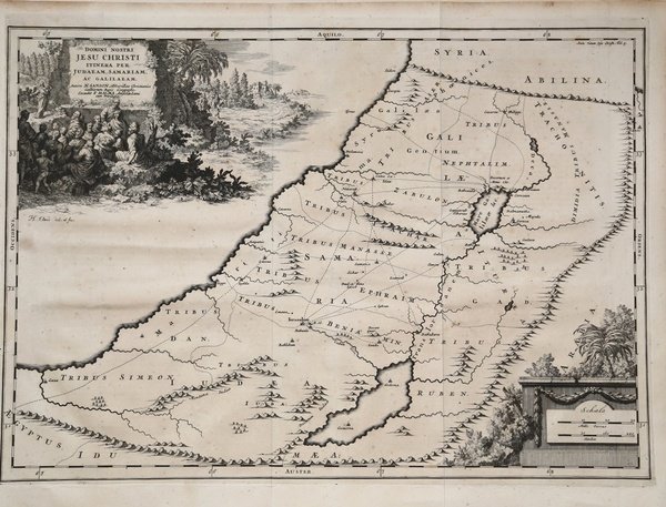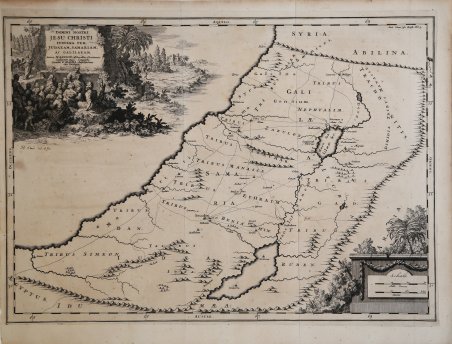 Decorativa carta della Terra Santa, che mostra i viaggi di Gesù attraverso la Giudea, la Samaria e la Galilea. Pubblicata nell'opera Geographia sacra : ex veteri et novo testamento desumpta, et in tabulas quatuor concinnata… di Nicola Sanson, edizione a cura di F. Halma, pubblicata nel 1704 ad Amsterdam.Bel cartiglio decorativo, inciso da H. Eland, con una grande vignetta che illustra Gesù risorto che si mostra a una folla di uomini, donne e bambini.Incisione su rame, lievi fioriture, tracce di pieghe, nel complesso in buono stato di conservazione. Fine, decorative folded map illustrating the ministry of Christ. The large title cartouche was engraved by H. Eland with an elaborate scene of one of Christ’s Resurrection appearances. From the N. Sanson' Geographia sacra : ex veteri et novo testamento desumpta, et in tabulas quatuor concinnata… Published by Francois Halma in 1704Copper engraving, light foxing, usual folds, otherwise in good condition. Cfr.