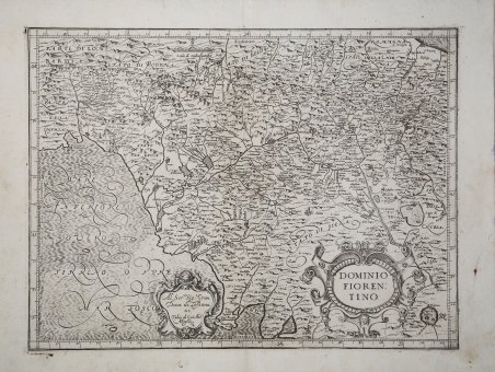 Carta geografica tratta dal ' L’Italia ' a cura di Fabio Magini, edito a Bologna nel 1620, tre anni dopo la prematura morte del padre. Composto da un breve testo descrittivo di sole 24 carte, l’opera è corredata di 61 carte geografiche della penisola, e costituisce il primo esempio di atlante italiano. L’opera è per intero di mano del Magini, che iniziò la realizzazione delle carte nel 1594 circa, dando alla luce per prima nel 1595 la carta del territorio di Bologna. Tutte le carte vennero alle stampe quindi prima del 1620, nelle loro stesure provvisorie, successivamente corrette ed aggiornate per l’edizione definitiva. Per la realizzazione delle lastre il Magini si servì di due dei più famosi intagliatori dell’epoca: il belga Arnoldo Arnoldi e l’inglese Benjamin Wright. La carta della Toscana del Magini deriva in tutto e per tutta dalla carta di Stefano Buonsignori, edita nel 1584, e rappresenta una delle poche opere in cui l’autore non apporta modifiche sostanziali al materiale in possesso. Incisa da Arnoldo Arnoldi. In basso, nel cartiglio a destra, il titolo ' DOMINIO FIORENTINO. ' Nel cartiglio al centro la dedica ' Al’ Ser.mo ' Sig:r ' Gran Duca di Toscana ' & ' c. Fabio di Gio[vanni] Ant.o ' Magini. ' In alto al centro la scala grafica ' Scala di miglia quindici ' (15 miglia pari amm 44). Orientazione nei quattro lati al centro con il nome dei punti cardinali ' Septentrio, Meridies, Oriens, Occidens, ' il nord in alto. Graduazione ai margini di 1’ in 1’ da 42° 21’ 30’’ a 44° 9’ ' (42° 7’ a 43° 55’ lato destro) di latitudine, e da 32° a 35° 22’ (32° 15’ a 35° 38’ lato in alto) di longitudine. Lieve gora nei margini, nel complesso in ottimo stato di conservazione. Bibliografia Almagià (1922): pp. 62-66, n. 17. Map taken from ' L'Italia ' edited by Fabio Magini, published in Bologna in 1620, three years after the untimely death of his father. Composed of a short descriptive text of only 24 pages, the work is accompanied by 61 maps of the peninsula, and is the first example of an Italian atlas. The work is entirely by the hand of Giovanni Antonio Magini, who began the realization of the maps in 1594 or so; the first dated map (1595) the map of the territory of Bologna. All the maps were printed before 1620, in their provisional drafts, later corrected and updated for the final edition. For the realization of the plates Magini used two of the most famous engravers of the time: the Belgian Arnoldo Arnoldi and the English Benjamin Wright. Copperplate, in good condition. Literature Almagià (1922): pp. 62-66, n. 17. Cfr.