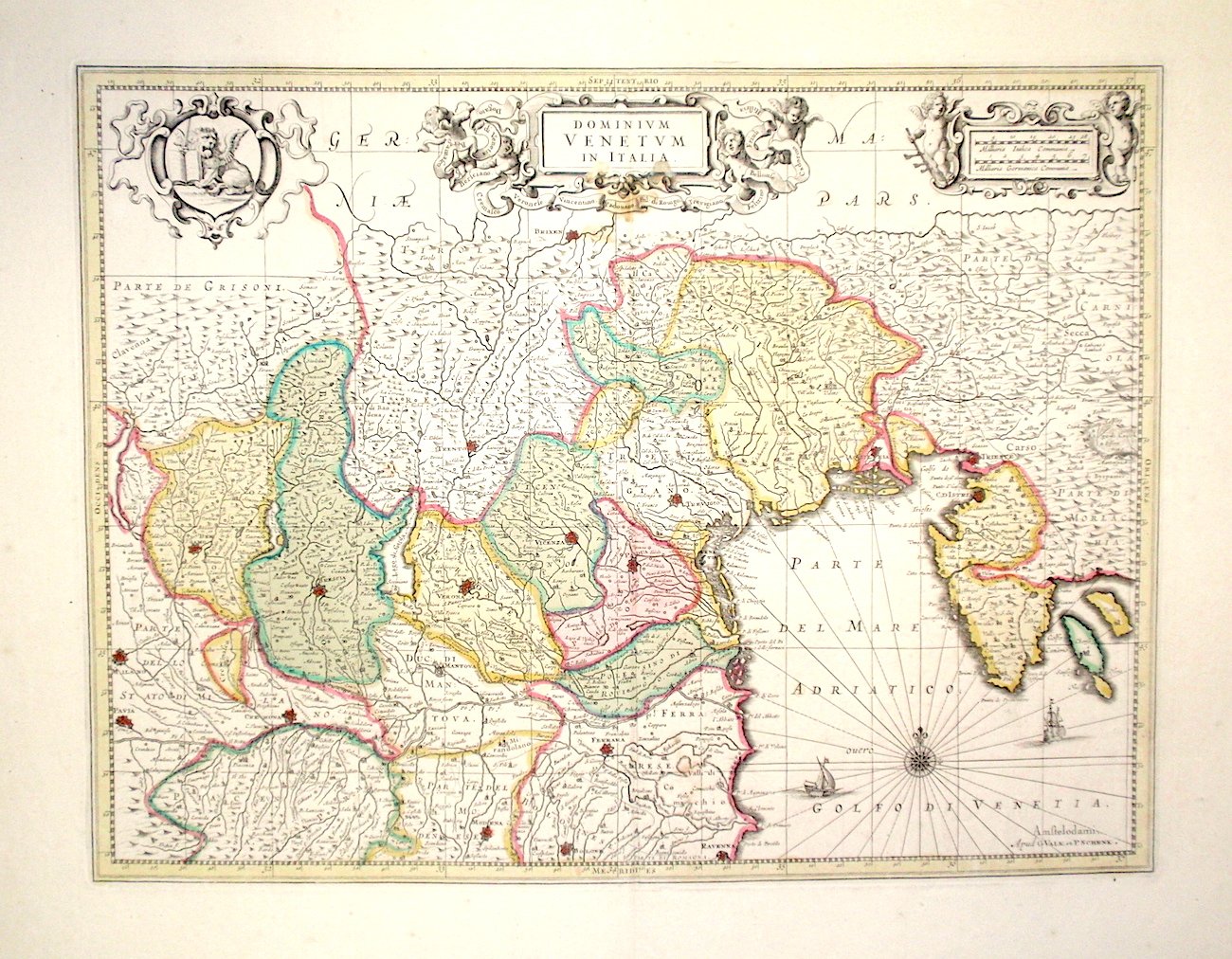 Incisione in rame, coloritura originale d'epoca, mm 380x495. La carta, arricchita da tre elaborati cartigli, illustra il Dominio di terra della Repubblica di Venezia, il quale comprende i territori compresi tra Bergamo e l'Istria. Schenk e Valk fondarono una società editoriale che pubblicò lastre acquistate da editori precedenti. Ottimo esemplare, assai marginoso, con restauri a minimi difetti al margine esterno. <BR>
