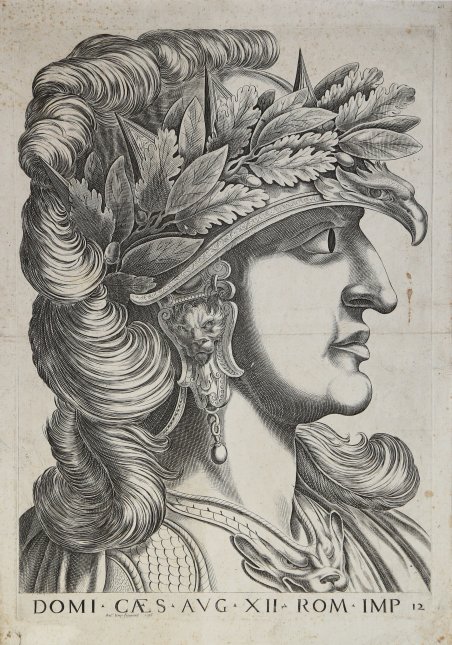 Acquaforte e bulino, 1596. Della serie "I dodici Imperatori".Bellissima prova, impressa su carta vergata con filigrana "doppio cerchio e giglio", con margini, traccia di pega centrale orizzontale, piccole ossidazioni in basso, per il resto in ottimo stato di conservazione.La serie è pubblicata a Roma dall'editore Tommaso Moneta nel 1596, su direzione per conto di Antonio Tempesta, come dimostra la scritta in basso "Antonius temp figurauit 1596". La medesima serie venne successivamente interpretata, per conto dell'editore Andrea Vaccari nel 1606, da Raffaello Schiaminossi (Bartsch XVII.235.98-110).Della raccolta di Tommaso Moneta sono conosciuti solo 3 serie complete, conservate ad Amburgo, Dresda e alla Farnesina di Roma.Opera molto rara.Ex collezione Bernfeld, Akim Gregorowitsch (Lugt 127). Etching and engraving, 1596. From the set of Twelve Caesars which was made after Tempesta in 1596, published by Tommaso Moneta in Rome. A fine impression, printed on laid paper with "double encircled fleur-de-lys " watermark, with margins, trace of horizontal central fold, otherwise in very good conditions. The plates are signed and dated: "Antonius temp figurauit 1596". So could be possible that Moneta published the set on behalf of Antonio Tempesta.Complete sets are held in Hamburg, Dresden and the Farnesina, Rome. The Raphael Schiaminossi set of Twelve Caesars (Bartsch XVII.235.98-110), which was published by Vaccari under papal privilege in Rome in 1606, is in fact a copy of the Tempesta published ten years earlier in 1596 by Tommaso Moneta. No acknowledgement of Tempesta's authorship is made in the 1606 copy.A very rare work.Ex collection Bernfeld, Akim Gregorowitsch (Lugt 127). Cfr.