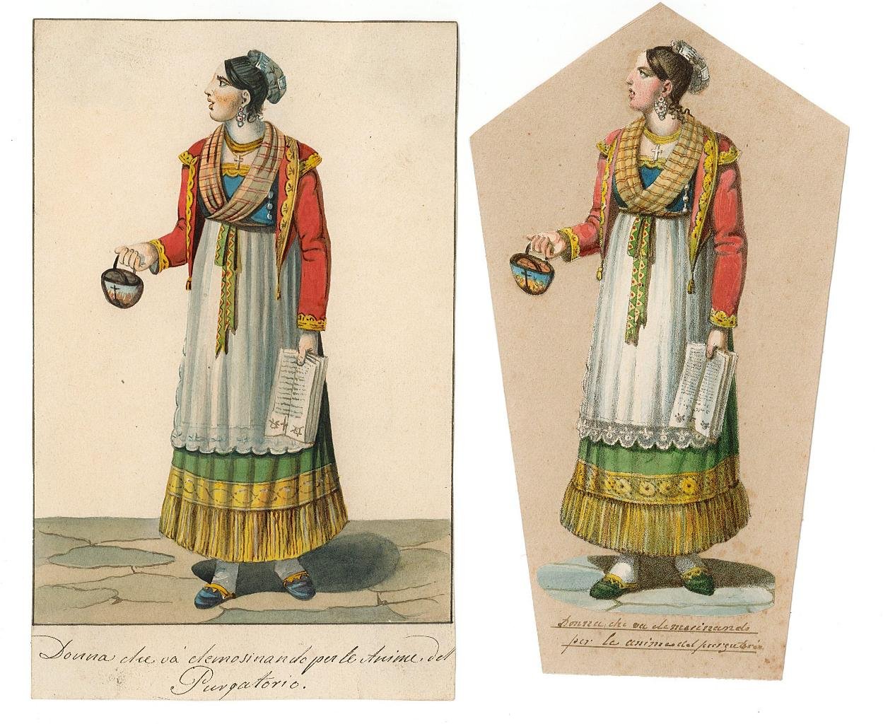 Delizioso acquarello raffigurante una donna del popolo nella raccolta dell'elemosina per la salvaguardia delle anime del Purgatorio. Al fianco la litografia, applicata su supporto cartaceo coevo, derivata dallo stesso soggetto di eguale grandezza.Autore: anonimo. Luogo: Napoli. Anno: 1840 ca. Tecnica: acquarello. Dimensioni: 160x100 mm. il foglio