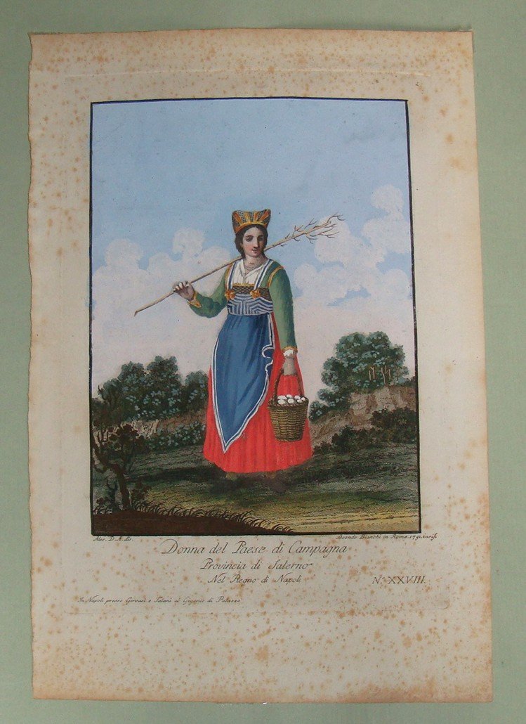 Donna del Paese di Campagna Provincia di Salerno nel Regno di Napoli. Incisione all'acquaforte rialzata a tempera. Ales. D’Anna dis. Secondo Bianchi in Roma 1791 incis. In Napoli presso Gervasi e Talani al Gigante di Palazzo. Cm. 30x21 oltre ampi margini. Splendida coloritura coeva. Si tratta della tavola n.XXVIII (prima parte) della rarissima "Raccolta di sessanta più belle vestiture che si costumano nelle provincie del Regno di Napoli".