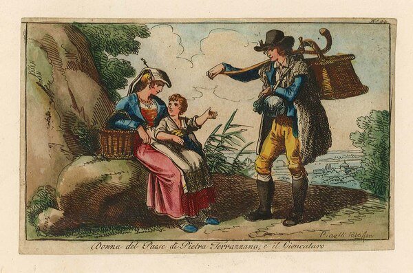 Stampa, antica e originale, incisa al tratto caratterizzata caratterizzata da una pregevole coloritura coeva all'acquerello raffigurante donna in costume tradizionale del paese di Pietra Terrazzana e il Gioncataro. Margini ridotti, applicata editorialmente su supporto cartaceo coevo.