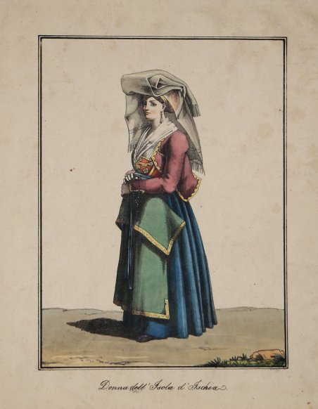 Scena di costume raffigurante una donna dell'Isola di Ischia con abiti tipici.Litografia in ottimo stato di conservazione. Scene of costume depicting a woman of the island of Ischia with typical clothes. ' Lithograph in excellent condition. Cfr.