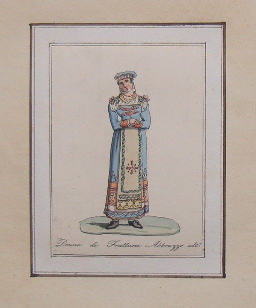 Donna di Frattura, Abruzzo Ulteriore. 1825 ca. Cm.9x7. Incisione acquarellata. Coloritura coeva.