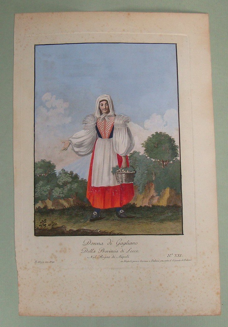 Donna di Gagliano della Provincia di Lecce nel Regno di Napoli. Incisione all'acquaforte rialzata a tempera. R. Aloja inc. 1791. In Napoli presso Gervasi e Talani passato il Gigante di Palazzo. Cm. 30x21 oltre ampi margini. Splendida coloritura coeva. Si tratta della tavola n.XXI (prima parte) della rarissima "Raccolta di sessanta più belle vestiture che si costumano nelle provincie del Regno di Napoli".