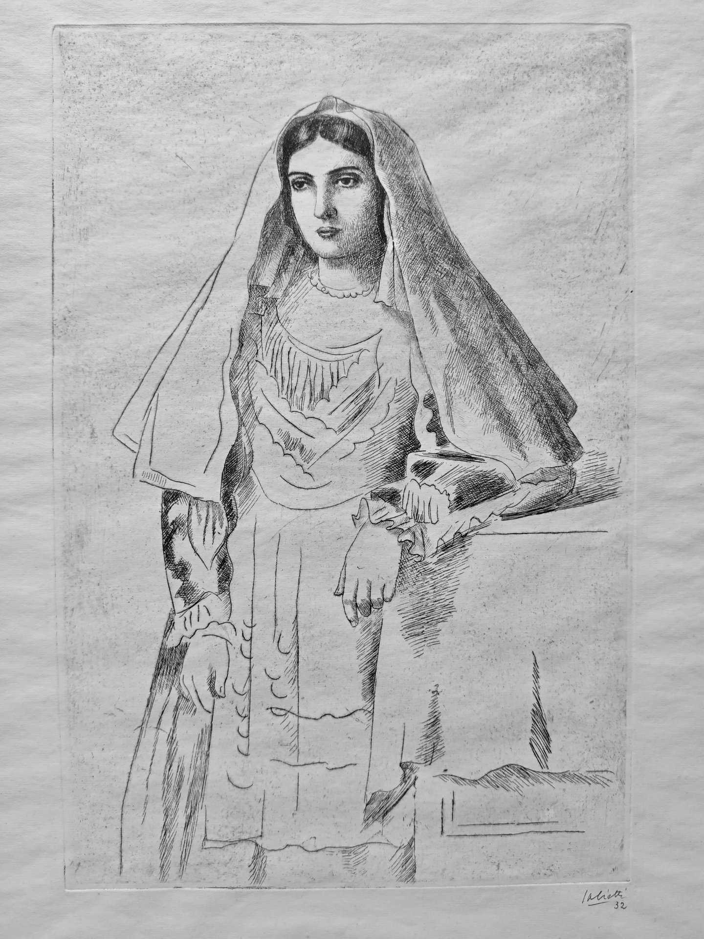 La gestazione di questo soggetto ha comportato un lungo ripensamento da parte dell'autore. La lastra è stata incisa inizialmente nel 1932 nei tratti essenziali e con un poche ombreggiature nelle zone scure condotte per tratti esclusivamente paralleli (anti lettera). Undici anni più tardi, nel 1943, Salietti riprende il rame modificandolo e cancellando e aggiungendo progressivamente il chiaroscuro tramite tratti incrociati, fino a modificare completamente le sembianze e le luci (stati da I a IV, cat 65-69). Esemplare della prima tiratura risalente al 1932 della quale era prevista una tiratura di 30 esemplari ma non si sa quanti effettivamente ne siano stati tirati. Rispetto all'esemplare pubblicato da Cicogna si riscontrano tuttavia alcune differenze, sono modificati alcuni contorni e aggiunti alcuni tratti nelle zone in ombra (volto, velo, polsino). Si tratta perciò di un esemplare in uno stato intermedio fra l'antelitteram e il I stato. Firma e data a matita in basso a destra: Salietti '32. Più in basso a matita si legge: copia a.l. La lastra, nello stato definitivo, è conservata presso la Calcografia di Stato a Roma. Al verso del foglio si segnala la traccia, ottenuta per contatto con un esemplare appena stampato, dell'incisione di Salietti Fiori 1942 (cat n 85).
