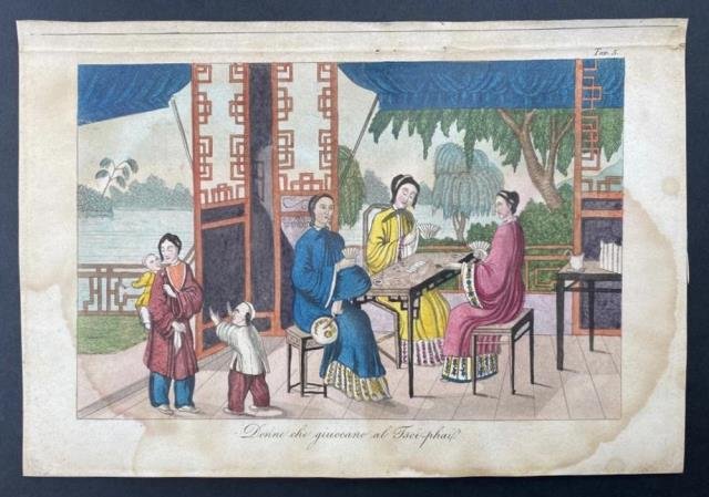 Tratta da "Il Costume Antico e Moderno" di Giulio Ferrario (Firenze, Vincenzo Batelli, 1823 - 1841), litografia in colore d'epoca, cm 15 x 22 cm circa (il foglio). Piacevole immagine che ritrae donne sedute impegnate nel gioco da tavolo del Tsci -phai, uno dei giochi da tavolo dei mercanti del the. Un leggero alone visibile ai margini, peraltro in splendida coloritura coeva e in buono stato.