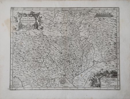 Carta geografica tratta dal ' L’Italia ' a cura di Fabio Magini, edito a Bologna nel 1620, tre anni dopo la prematura morte del padre. Composto da un breve testo descrittivo di sole 24 carte, l’opera è corredata di 61 carte geografiche della penisola, e costituisce il primo esempio di atlante italiano. L’opera è per intero di mano del Magini, che iniziò la realizzazione delle carte nel 1594 circa, dando alla luce per prima nel 1595 la carta del territorio di Bologna. Tutte le carte vennero alle stampe quindi prima del 1620, nelle loro stesure provvisorie, successivamente corrette ed aggiornate per l’edizione definitiva. Per la realizzazione delle lastre il Magini si servì di due dei più famosi intagliatori dell’epoca: il belga Arnoldo Arnoldi e l’inglese Benjamin Wright. La prima stesura della carta del Monferrato del Magini è probabilmente realizzata basandosi su un disegno fornitogli dal Duca di Mantova. Non sono infatti rilevanti le influenze delle carte del Piemonte fino ad allora stampate, dal Gastaldi al Mercator. La successiva revisione, probabilmente nel 1607, viene invece influenzata dalla carta Disegno Particolare del Piemonte et Monferrato e suoi confini pubblicata alla fine del cinquecento da Fabrizio Stechi. Questa del Magini è quindi da considerarsi come la prima del solo Monferrato. Esemplare del secondo stato, con imprint di Fabio Magini e la dedica a Caterina Medici Gonzaga che sostituisce la precedente ad Alvise D'Avila di Giovanni Antonio Magini. In alto, nel cartiglio a sinistra, il titolo DUCATO DEL MONFERRATO Con parte del Piemonte. a destra la scala grafica Scala di Miglia dodici (12 miglia pari a mm 52). Nel cartiglio in basso a destra la dedica Alla Ser.ma Sig.ra Caterina Medici Gonzaga Duchessa di Ma[n]tova et di Monferrato etc. cambia l’imprint editoriale Fabio di Gio. Antonio Maginj Padovano Math.co dello Studio di Bologna. Orientazione nei quattro lati al centro con il nome dei punti cardinali Septentrio, Meridies, Oriens, Occidens, il nord a destra. Graduazione ai margini di 1’ in 1’ da 43° 51’ 50’’ a 45° 1’ 10’’ di latitudine, e da 29° 49’’ a 31° 20’ di longitudine. Bibliografia Almagià pagg. 25/28; Arrigoni-Bertarelli (1930): p. 101, n. 910; Barrera (1991): p. 26, n. 85 e p. 28, n. 15. Map taken from ' L'Italia ' edited by Fabio Magini, published in Bologna in 1620, three years after the untimely death of his father. Composed of a short descriptive text of only 24 pages, the work is accompanied by 61 maps of the peninsula, and is the first example of an Italian atlas. The work is entirely by the hand of Giovanni Antonio Magini, who began the realization of the maps in 1594 or so; the first dated map (1595) the map of the territory of Bologna. All the maps were printed before 1620, in their provisional drafts, later corrected and updated for the final edition. For the realization of the plates Magini used two of the most famous engravers of the time: the Belgian Arnoldo Arnoldi and the English Benjamin Wright. The first version of this map of the Monferrato region is probably based upon a drawing given to him by the Duke of Mantua since no influence of previous ones, such as those by Gastaldi and Mercator, can be seen. The following version, probably from 1607, instead bears the mark of a map published at the end of the sixteenth century by Fabrizio Stechi which was called Disegno Particolare del Piemonte et Monferrato e suoi confini. This is the first map dedicated only to the Monferrato region. Engraved by Benjamin Wright. Slightly spoiled at margins, overall in very good conditions. La prima stesura della carta del Monferrato del Magini è probabilmente realizzata basandosi su un disegno fornitogli dal Duca di Mantova. Non sono infatti rilevanti le influenze delle carte del Piemonte fino ad allora stampate, dal Gastaldi al Mercator. La successiva revisione, probabilmente nel 1607, viene invece influenzata dalla carta ' Disegno Particolare del Piemonte et Monferrato e suoi confini ' pubblicata alla fine del cinquecento da Fabrizio Stechi. Questa del Magini è quindi da considerarsi come la prima del solo Monferrato. Esemplare del secondo stato, con imprint di Fabio Magini e la dedica a Caterina Medici Gonzaga che sostituisce la precedente ad Alvise D'Avila di Giovanni Antonio Magini. In alto, nel cartiglio a sinistra, il titolo ' DUCATO DEL MONFERRATO Con parte del Piemonte. ' a destra la scala grafica ' Scala di Miglia dodici ' (12 miglia pari a mm 52). Nel cartiglio in basso a destra la dedica ' Alla Ser.ma ' Sig.ra ' Caterina Medici Gonzaga Duchessa di Ma[n]tova et di Monferrato etc. ' cambia l’imprint editoriale ' Fabio di Gio. Antonio Maginj Padovano Math.co ' dello Studio di Bologna. ' Orientazione nei quattro lati al centro con il nome dei punti cardinali ' Septentrio, Meridies, Oriens, Occidens, ' il nord a destra. Graduazione ai margini di 1’ in 1’ da 43° 51’ 50’’ a 45° 1’ 10’’ di latitudine, e da 29° 49’’ a 31° 20’ di longitudine. Bibliografia Almagià pagg. 25/28; Arrigoni-Bertarelli (1930): p. 101, n. 910; ' Barrera (1991): p. 26, n. 85 e p. 28, n. 15. Cfr.