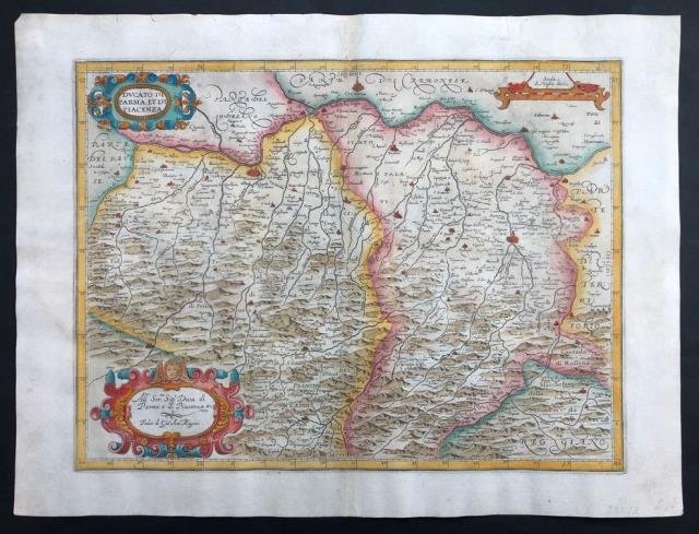 Dall’ “Italia” edita a Bologna a cura di Fabio Magini dal 1620 al 1640 circa. Incisione in rame all’acquaforte in recente ma professionale coloritura, cm 34,7 x 46,2 (alla lastra) più margini. Dedica entro cartiglio al Serenissimo Signor Duca di Parma e di Piacenza. Lieve ingiallimento della brachetta centrale, uno strappo restaurato nella parte sinistra del foglio, impressione un po’ stanca, nell’insieme buono stato di conservazione.