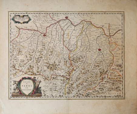 Carta geografica del territorio di Parma e Piacenza, eseguita sul modello di Magini. Willem Janszoon Blaeu, avviò nel 1599 la sua attività di costruttore di globi e strumenti astronomici ad Amsterdam. Nel 1630, dopo aver comprato alcune lastre dell’atlante del Mercator da Jodocus Hondius II, fu in grado di pubblicare un volume di 60 mappe con il titolo di ' Atlantis Appendix. Cinque anni dopo, pubblicò i primi due volumi del suo atlante ' Atlas Novus ' o ' Theatrum Orbis Terrarum, ' in sei libri. Dopo la sua morte, Joan (Johannes) continuò l’opera paterna, completando l’intera serie di sei volume dell’Atlas Novus ' intorno al 1655. Fu inoltre autore di un ' Atlas Maior sive Cosmographia Blaviana, in 12 volumi pubblicati nel 1662 -72, dei quali uno dedicato all'Italia. La carta compare per la prima volta nel terzo volume del ' Theatrum. ' Secondo Koeman viene pubblicata in primis nell'edizione francese del 1640, dal titolo ' Le Theatre du Monde ou Nouvel Atlas, ' Mis en lumiere par Guillaume & Jean Blaeu. ' Troisieme partie. A Amsterdam, Chez Iean & Corneille Blaeu MDCXL. Il terzo volume del ' Theatrum ' contiene 58 carte dell'Italia e 4 della Grecia (cfr. Koeman, ' Atlas Neerlandici, pp. 160-162, Bl 35A). Le carte dell'italia derivano tutte dall'opera di Giovanni Antonio Magini. Tuttavia, sembra più probabile che il Blaeu si basi sue quelle di Hendrick Hondius e Johannes Janssonius pubblicate nel ' Theatrum Italiae in quo Eius Regna, Domina, Ducatus, Et Speciatim Illorum Provinciae, Tabulis Accuratissimis, Iam, De Novo in Lucem Editio, Describunter, Quorum Sequens Pagina Indicabit, stampato ad Amsterdam da Hendrick Hondius nel 1636. ' Sebbene pubblicate dopo la morte di Willem Janszoon Blaeu (1638) le carte spesso recano il suo imprint. Non è dato sapere se fossero tutte già pronte o se i figli Johannes e Cornelis le compilarono postume. Incisione in rame, coloritura coeva, in ottimo stato di conservazione. Testo francese al verso. Map of the territory of Parma and Piacenza. Willem Janszoon Blaeu, started in 1599 his business as a builder of globes and astronomical instruments in Amsterdam. In 1630, after buying some plates of the Mercator atlas from Jodocus Hondius II, he was able to publish a volume of 60 maps under the title ' Atlantis Appendix. Five years later, he published the first two volumes of his atlas ' Atlas Novus ' or ' Theatrum Orbis Terrarum, in six books. After his death, Joan (Johannes) continued his father's work, completing the entire six-volume ' Atlas Novus ' series around 1655. He was also the author of an ' Atlas Maior sive Cosmographia Blaviana, in 12 volumes published in 1662 -72, one of which was devoted to Italy. The map first appears in the third volume of the Theatrum. According to Koeman it is first published in the French edition of 1640, entitled Le Theatre du Monde ou Nouvel Atlas, Mis en lumiere par Guillaume & Jean Blaeu. Troisieme partie. In Amsterdam, Chez Iean & Corneille Blaeu MDCXL. The third volume of the Theatrum contains 58 maps of Italy and 4 of Greece (see Koeman, Atlas Neerlandici, pp. 160-162, Bl 35A). The maps of Italy are all derived from the work of Giovanni Antonio Magini. However, it seems more likely that Blaeu relies on those of Hendrick Hondius and Johannes Janssonius published in Theatrum Italiae in quo Eius Regna, Domina, Ducatus, Et Speciatim Illorum Provinciae, Tabulis Accuratissimis, Iam, De Novo in Lucem Editio, Describunter, Quorum Sequens Pagina Indicabit, printed in Amsterdam by Hendrick Hondius in 1636. Although published after the death of Willem Janszoon Blaeu (1638) the maps often bear his imprint. It is not known whether they were all ready-made or if his sons Johannes and Cornelis completed them posthumously. Copperplate, in very good conditions. Cfr.