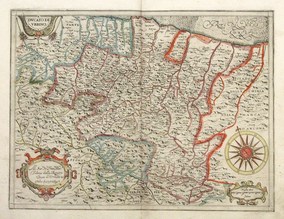 Incisione in rame, mm 350x460, colorata d'epoca. Fascinosa carta del territorio, tratta da "Italia" il fondamentale primo atlante con carte di tutta la penisola, che il geografo e matematico Magini realizzò a fine '500, ma che, a causa della sua morte, fu pubblicato solo nel 1620 dal figlio. Grazie ai contatti personali con le istituzioni ed i più importanti cartografi del tempo, Magini ebbe a disposizione materiale cartografico talvolta inedito o comunque non disponibile per gli studiosi. La sua opera costituì il fondamento di tutta la cartografia del XVII secolo, venendo costantemente copiata da tutti i successivi autori. Cartiglio in basso a sinistra con la dedica a Francesco Maria Feltrio della Rovere, in alto col titolo e rosa dei venti in basso a destra. Ottimo esemplare