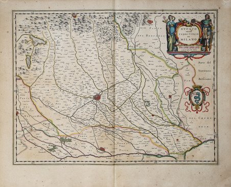 Elegante carta eseguita sul modello di Magini. Willem Janszoon Blaeu, avviò nel 1599 la sua attività di costruttore di globi e strumenti astronomici ad Amsterdam. Nel 1630, dopo aver comprato alcune lastre dell’atlante del Mercator da Jodocus Hondius II, fu in grado di pubblicare un volume di 60 mappe con il titolo di ' Atlantis Appendix. Cinque anni dopo, pubblicò i primi due volumi del suo atlante ' Atlas Novus ' o ' Theatrum Orbis Terrarum, ' in sei libri. Dopo la sua morte, Joan (Johannes) continuò l’opera paterna, completando l’intera serie di sei volume dell’Atlas Novus ' intorno al 1655. Fu inoltre autore di un ' Atlas Maior sive Cosmographia Blaviana, in 12 volumi pubblicati nel 1662 -72, dei quali uno dedicato all'Italia. La carta compare per la prima volta nel terzo volume del ' Theatrum. ' Secondo Koeman viene pubblicata in primis nell'edizione francese del 1640, dal titolo ' Le Theatre du Monde ou Nouvel Atlas, ' Mis en lumiere par Guillaume & Jean Blaeu. ' Troisieme partie. A Amsterdam, Chez Iean & Corneille Blaeu MDCXL. Il terzo volume del ' Theatrum ' contiene 58 carte dell'Italia e 4 della Grecia (cfr. Koeman, ' Atlas Neerlandici, pp. 160-162, Bl 35A). Le carte dell'italia derivano tutte dall'opera di Giovanni Antonio Magini. Tuttavia, sembra più probabile che il Blaeu si basi sue quelle di Hendrick Hondius e Johannes Janssonius pubblicate nel ' Theatrum Italiae in quo Eius Regna, Domina, Ducatus, Et Speciatim Illorum Provinciae, Tabulis Accuratissimis, Iam, De Novo in Lucem Editio, Describunter, Quorum Sequens Pagina Indicabit, stampato ad Amsterdam da Hendrick Hondius nel 1636. ' Sebbene pubblicate dopo la morte di Willem Janszoon Blaeu (1638) le carte spesso recano il suo imprint. Non è dato sapere se fossero tutte già pronte o sei i figli Johannes e Cornelis le compilarono postume. Tratta dall'edizione ' olandese. ' Incisione in rame, in ottimo stato di conservazione. Striking wide margined example of Blaeu's decorative map of the ' territory of Milano. Willem Janszoon Blaeu, started in 1599 his business as a builder of globes and astronomical instruments in Amsterdam. In 1630, after buying some plates of the Mercator atlas from Jodocus Hondius II, he was able to publish a volume of 60 maps under the title ' Atlantis Appendix. Five years later, he published the first two volumes of his atlas ' Atlas Novus ' or ' Theatrum Orbis Terrarum, in six books. After his death, Joan (Johannes) continued his father's work, completing the entire six-volume ' Atlas Novus ' series around 1655. He was also the author of an ' Atlas Maior sive Cosmographia Blaviana, in 12 volumes published in 1662 -72, one of which was devoted to Italy. The map first appears in the third volume of the Theatrum. According to Koeman it is first published in the French edition of 1640, entitled Le Theatre du Monde ou Nouvel Atlas, Mis en lumiere par Guillaume & Jean Blaeu. Troisieme partie. In Amsterdam, Chez Iean & Corneille Blaeu MDCXL. The third volume of the Theatrum contains 58 maps of Italy and 4 of Greece (see Koeman, Atlas Neerlandici, pp. 160-162, Bl 35A). The maps of Italy are all derived from the work of Giovanni Antonio Magini. However, it seems more likely that Blaeu relies on those of Hendrick Hondius and Johannes Janssonius published in Theatrum Italiae in quo Eius Regna, Domina, Ducatus, Et Speciatim Illorum Provinciae, Tabulis Accuratissimis, Iam, De Novo in Lucem Editio, Describunter, Quorum Sequens Pagina Indicabit, printed in Amsterdam by Hendrick Hondius in 1636. Although published after the death of Willem Janszoon Blaeu (1638) the maps often bear his imprint. It is not known whether they were all ready-made or if his sons Johannes and Cornelis completed them posthumously. Sebbene pubblicate dopo la morte di Willem Janszoon Blaeu (1638) le carte spesso recano il suo imprint. Non è dato sapere se fossero tutte già pronte o sei i figli Johannes e Cornelis le compilarono postume. Dutch text on verso.Copperplate, in very good conditions. Cfr.