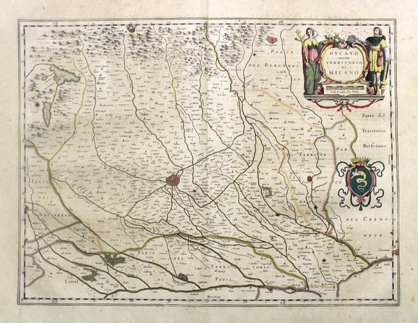 Incisione in rame, mm 385x510, testo latino al verso. Elegante e piacevole carta del territorio fra il Po e Como, arricchita da cartigli e stemmi. Ottimo esemplare perfettamente conservata anche se lievemente ingiallita. W. Blaeu, astronomo allievo di Tycho Brahe, fondò un'officina per la costruzione di globi nel 1599; quasi immediatamente iniziò a pubblicare anche carte geografiche, giungendo nel 1630 alla creazione del primo atlante "Atlantis Appendix" e cinque anni dopo, della prima edizione in due tomi del "Atlas Novus". Dopo la sua morte nel 1638, a cura del figlio Johan si giunse nel 1662 alla pubblicazione del celebre "Atlas Maior" in 11 volumi. Nel 1672 un incendio distrusse l'officina e segnò la fine dell'attività. <BR>Copper engraving, mm 385x510, latin text on verso. Elegant map of territory between the river Po and Como. Good condition even if slightly discolored. W. Blaeu, born in Alkmaar in 1571, studied astronomy by Tycho Brahe and founded a business in 1599 as a globe and instrument maker. He immediately expanded the business publishing maps and in 1630 the first atlas "Atlantis appendix" and five years later the "Atlas novus". After his death in 1638, his son Joan reached publication of the major work of the family, the "Atlas maior" in 11 volumes. In 1672 a great fire destroyed the Blaeu's printing house. <BR>