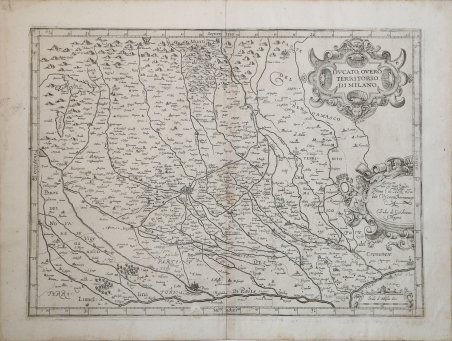 Nella parte destra, nel cartiglio in alto, il titolo ' DUCATO, OVERO TERRITORIO DI MILANO. ' Nel cartiglio centrale la dedica ' All’ Ill.mo ' ' mio Sig.r ' et P[ad]rone Col.mo ' Il S.r ' Co: Fabio Visconti Borromeo. ' Segue l’imprint editoriale ' Fabio di Gio[vanni] Antonio Magini. ' in basso la scala grafica ' Scala di Miglia dieci ' (10 miglia pari a mm ' 58). Orientazione nei quattro lati al centro con il nome dei punti cardinali ' Septentrio, Meridies, Oriens, Occidens, ' il nord in alto. Graduazione ai margini di 1’ in 1’ da 44° 35’ 45’’ a 45° 26’ 15’’ d latitudine, e da 30° 46’ 45’’ a 32° 26’ di longitudine. ' "Le carte dello Stato di Milano nell'Italia maginiana sono cinque [.] sono della stessa fattura e del medesimo stile delle carte del Piemonte e della Liguria ' della prima redazione e come quelle sono certo opera dell'incisore Arnoldo di Arnoldi; le dediche sono tutte firmate da Fabio Magini, ma parte sono aggiunte posteriormente, parte sono sovrapposte ad altre precedenti cancellate sul rame. Queste carte dello Stato di Milano sono certamente tra le prime, alle quali il Magini mise mano nell'accingersi alla sua grande opera: sappiamo infatti dalla lettera al duca di Mantova in data 25 novembre 1596, che a quell'epoca esse erano già intagliate" (cfr. ' Roberto ' Almagià, ' L'Italia di Giovanni Antonio Magini e la Cartografia dell'Italia nei secoli XVI e XVII ' (1922), p. 30). Le fonti cartografiche per questa mappa, come giustamente nota Almagià, sono da ricercarsi nelle precedenti carte a stampa - la ' Langobardia ' di Luca Antonio degli Uberti del 1520 circa, la ' Lombardia ' di Giacomo Gastaldi del 1559, il ' Ducatus Mediolanensis di ' Giorgio Settala riprodotto da A. Ortelius nel 1570, la ' Lombardia ' di Gerard Mercator del 1589 - e nella pittura di Ignazio Danti nelle Logge Vaticane. ' Esemplare ' tratto dal ' L’Italia, edito a Bologna nel 1620, tre anni dopo la scomparsa del padre. Composto da un breve testo descrittivo di sole 24 carte, l’opera è corredata di 61 carte geografiche della penisola, e costituisce il primo esempio di atlante italiano. L’opera è per intero di mano del Magini, che iniziò la realizzazione delle carte nel 1594 circa, dando alla luce per prima nel 1595 la carta del territorio di Bologna. Tutte le carte vennero alle stampe quindi prima del 1620, nelle loro stesure provvisorie, successivamente corrette ed aggiornate per l’edizione definitiva. Per la realizzazione delle lastre il Magini si servì di due dei più famosi intagliatori dell’epoca: il belga Arnoldo Arnoldi e l’inglese Benjamin Wright. Bibliografia R. Almagià, ' L'Italia di Giovanni Antonio Magini e la Cartografia dell'Italia nei secoli XVI e XVII ' (1922): ' pp. 30-34, n. 4. Map taken from ' L'Italia ' edited by Fabio Magini, published in Bologna in 1620, three years after the untimely death of his father. Composed of a short descriptive text of only 24 pages, the work is accompanied by 61 maps of the peninsula, and is the first example of an Italian atlas. The work is entirely by the hand of Giovanni Antonio Magini, who began the realization of the maps in 1594 or so; the first dated map (1595) the map of the territory of Bologna. All the maps were printed before 1620, in their provisional drafts, later corrected and updated for the final edition. For the realization of the plates Magini used two of the most famous engravers of the time: the Belgian Arnoldo Arnoldi and the English Benjamin Wright. Copperplate, in good condition. Nella parte destra, nel cartiglio in alto, il titolo ' DUCATO, OVERO TERRITORIO DI MILANO. ' Nel cartiglio centrale la dedica ' All’ Ill.mo ' ' mio Sig.r ' et P[ad]rone Col.mo ' Il S.r ' Co: Fabio Visconti Borromeo. ' Segue l’imprint editoriale ' Fabio di Gio[vanni] Antonio Magini. ' in basso la scala grafica ' Scala di Miglia dieci ' (10 miglia pari a mm ' 58). Orientazione nei quattro lati al centro con il nome dei punti cardinali ' Septentrio, Meridies, Oriens, Occidens, ' il nord in alto. Graduazione ai margini di 1’ in 1’ da 44° 35’ 45’’ a 45° 26’ 15’’ d latitudine, e da 30° 46’ 45’’ a 32° 26’ di longitudine. ' Cfr.