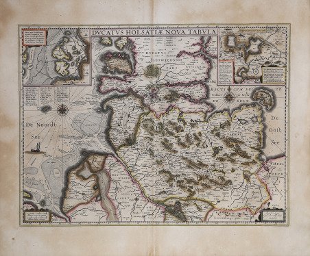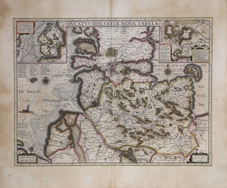 Carta geografica del Ducato di Holstein tratta dal Appendix Teatri A. Ortelii et Atlantis G. Mercatoris continens Tabvlas Geographicas di W. J. Blaeu. ' Willem Janszoon Blaeu, avviò nel 1599 la sua attività di costruttore di globi e strumenti astronomici ad Amsterdam. Nel 1630, dopo aver comprato alcune lastre dell’atlante del Mercator da Jodocus Hondius II, fu in grado di pubblicare un volume di 60 mappe con il titolo di Atlantis Appendix. Cinque anni dopo, pubblicò i primi due volumi del suo atlante Atlas Novus o Theatrum Orbis Terrarum, in sei libri. Dopo la sua morte, Joan (Johannes) continuò l’opera paterna, completando l’intera serie di sei volume dell’Atlas Novus intorno al 1655. Fu inoltre autore di un Atlas Maior sive Cosmographia Blaviana, in 12 volumi pubblicati nel 1662 -72, dei quali uno dedicato all'Italia. Incisione in rame, coloritura coeva, in ottimo stato di conservazione. Old color example of Blaeu's ap of the Duchy of Holstein. Includes 2 large inset maps. Extends to Hamburg, Lubeck, Kiel, etc. ' Willem Blaeu, founder of the famous publishing firm. Originally publishing pilot-guides, he issued his first atlas, 'Atlantis Appendix', in 1630, followed by his "Theatrum Orbis Terrarum" or "Novus Atlas" in 1635. Willem Janszoon Blaeu, started in 1599 his business as a builder of globes and astronomical instruments in Amsterdam. In 1630, after buying some plates of the Mercator atlas from Jodocus Hondius II, he was able to publish a volume of 60 maps under the title Atlantis Appendix. Five years later, he published the first two volumes of his atlas Atlas Novus or Theatrum Orbis Terrarum, in six books. After his death, Joan (Johannes) continued his father's work, completing the entire six-volume Atlas Novus series around 1655. He was also the author of an Atlas Maior sive Cosmographia Blaviana, in 12 volumes published in 1662 -72, one of which was devoted to Italy. ' Copperplate with original hand colur, very good condition. Cfr.
