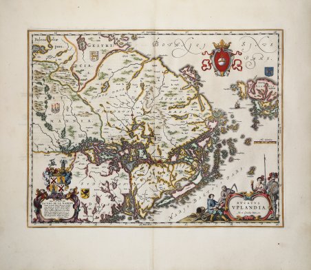 Carta splendidamente incisa ed eseguita dell'area del moderno territorio di Uppsala, nelle vicinanze di Stoccolma, e comprendente gran parte dell'Aland di Blaeu. Con uno stemma svedese, un cartiglio figurato con popolazioni rurali e un cavaliere in amore, un cartiglio allegorico con stemma dedicato a 'D. Michaeli le Blon". Carta decorativa della Gothia pubblicata per la prima volta nel 1640 da Johannes & Cornelis Blaeu; questo esemplare proviene da Atlas Maior, Sive Cosmographia Blaviana, Qua Solum, Salum, Coelum, Accuratissime Describuntur. Amsterdam, J. Blaeu, 1662-65. Willem Janszoon Blaeu, avviò nel 1599 la sua attività di costruttore di globi e strumenti astronomici ad Amsterdam. Nel 1630, dopo aver comprato alcune lastre dell’atlante del Mercator da Jodocus Hondius II, fu in grado di pubblicare un volume di 60 mappe con il titolo di ' Atlantis Appendix. Cinque anni dopo, pubblicò i primi due volumi del suo atlante ' Atlas Novus ' o ' Theatrum Orbis Terrarum, ' in sei libri. Dopo la sua morte, Joan (Johannes) continuò l’opera paterna, completando l’intera serie di sei volume dell’Atlas Novus ' intorno al 1655. Fu inoltre autore di un ' Atlas Maior sive Cosmographia Blaviana, in 12 volumi pubblicati nel 1662 -72. Incisione in rame, finemente colorata a mano, in ottimo stato di conservazione. A beautifully engraved and executed map of the area of the modern Uppsala land in the vicinity of Stockholm, and includes most of Aland by Blaeu. With a Swedish coat of arms, a figural cartouche with rural people and a knight in amour, a allegoric cartouche with coat of arms dedicated to 'D. Michaeli le Blon'. Decorative map of Gothia first published in 1640 by Johannes & Cornelis Blaeu. This example comes from Atlas Maior, Sive Cosmographia Blaviana, Qua Solum, Salum, Coelum, Accuratissime Describuntur. Amsterdam, J. Blaeu, 1662-65. Joan, or Johannes, Blaeu (1596-1673) was the son of Willem Janszoon Blaeu. He inherited his father’s meticulous and striking mapmaking style and continued the Blaeu workshop until it burned in 1672. ' After his father’s death in 1638, Joan and his brother, Cornelis, took over their father’s shop and Joan took on his work as hydrographer to the Dutch East India Company. Joan also modified and greatly expanded his father’s Atlas novus, first published in 1635. All the while, Joan was honing his own atlas. He published the Atlas maior between 1662 and 1672. It is one of the most sought-after atlases by collectors and institutions today due to the attention to the detail, quality, and beauty of the maps. Cfr.