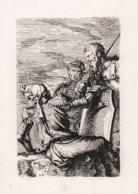 Acquaforte, circa 1675/80, priva di firma. Copia in controparte della stampa di Salvator Rosa, della serie dei capricci con soldati, detta le ' Figurine. ' La serie delle cosiddette ' Figurine ' di Salvator Rosa ebbe un grande successo, documentato dal gran numero di imitazioni che ebbe in tutta Europa. La prima edizione di questa raccolta fu realizzata dal Rosa in 62 tavole all’acquaforte incise tra il 1656 e il 1657. Almeno otto diverse copie della stessa edizione furono eseguite tra la fine del XVII e la prima metà del XVIII secolo. ' ' La serie venne inserita nella celebre ' Academia Todesca della Architectura, Scultura & Pittura: oder Teutsche Academie der Edlen Bau, Bild-und Mahlerey-Künste, raccolta monumentale, riccamente illustrata da centinaia di incisioni raffiguranti antichità, architettura e mitologia classica, edita a Norimberga e Francoforte tra il 1675 ed il 1680. ' Per le incisioni, il Sandrart si avvalse dei suoi collaboratori Karl Gustav von Amling (1650-1703); Philip Kilian (1628-1693); Richard Collin (1627-97); Georg Andreas Wolfgang (1631-1716); Johann Georg Waldreich (d.1680); Melchior Küsel (1626-1683); Franck, Johann (fl.1659-1690); George Christoph Eimmart (1638-1705); Susanna Maria von Sandrart (1658-1716); Bartholomäus Kilian (1630-1696). Bellissima prova, impressa su carta vergata coeva, con margini, in perfetto stato di conservazione. ' Bibliografia Cfr. Bartsch, Le ' Peintre graveur ' (XX.283.51); Wallace p. 330, 133; National Gallery (Washington), ' Mark J. Millard, III (1998), no. 111; F.W. H. Hollstein, ' German engravings . ca. 1400-1700 ' (1954-), 38-41; Anna Schreurs, ' Unter Minerva schutz: bildung durch kunst in Joachim von Sandrarts 'Teutscher Academie' ' (2012). Etching, ca. 1675/80, unsigned. Copy of Salvator Rosa's print from the Capricci with soldiers series, called the ' Figurine. The series of the so-called ' Figurine ' of Salvator Rosa had a great success, documented by the large number of imitations that had throughout Europe. The first edition of this collection was made by Rosa in 62 etching plates engraved between 1656 and 1657. At least eight different copies of the same edition were made between the end of the 17th and the first half of the 18th century. This set is part of the monumental ' Academia Todesca della Architectura, Scultura & Pittura: oder Teutsche Academie der Edlen Bau, Bild-und Mahlerey-Künste ' (Deutsche Academy of Architecture - Sculpture – Painting). ' The first edition, in German, was published by Joachim von Sandrart in Nuremberg, in three volumes respectively in 1675, 1679 and 1680. For the plates Sandrart used his students as and many others artist as ' Karl Gustav von Amling (1650-1703); Philip Kilian (1628-1693); Richard Collin (1627-97); Georg Andreas Wolfgang (1631-1716); Johann Georg Waldreich (d.1680); Melchior Küsel (1626-1683); Franck, Johann (fl.1659-1690); George Christoph Eimmart (1638-1705); Susanna Maria von Sandrart (1658-1716); Bartholomäus Kilian (1630-1696). The work is full of illustrations of ancient and modern Roman buildings, sculpture, the theory of painting, biographies of artists, including German and contemporary (ie seventeenth-century) artists, and antiquities. Joachim von Sandrart was a painter of some note but it is for his ' Teutsche Academie ' that he is chiefly remembered. His compendious treatise includes sections on ancient sculpture and architecture, perspective, the theory of painting, artists’ biographies, a translation of Ovid’s Metamorphoses and so on. The second part of Book I purports to give a history of art from its earliest origins, and opens with an engraving of two scenes of legendary accounts of the discovery of drawing. ' The work is dedicated to the world-renowned German nation and to champions and lovers of art ('Der Welt-berühmten Teutschen Nation . Kunst-Helden und Kunstliebenden'). Beautiful proof, printed on contemporary laid paper, with margins, in perfect condition. Bibliografia Cfr. Bartsch, Le ' Peintre graveur ' (XX.283.51); Wallace p. 330, 133; National Gallery (Washington), ' Mark J. Millard, III (1998), no. 111; F.W. H. Hollstein, ' German engravings . ca. 1400-1700 ' (1954-), 38-41; Anna Schreurs, ' Unter Minerva schutz: bildung durch kunst in Joachim von Sandrarts 'Teutscher Academie' ' (2012). Cfr.