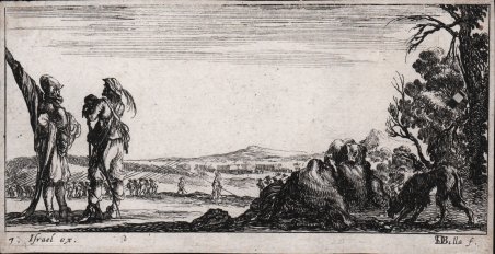 A sinistra, due soldati in piedi che parlano, un cavallo morto a destra divorato da due lupi e un drappello di lancieri dietro a sinistra. Acquaforte, 1644 circa, con iscrizione nel margine sotto l'immagine con i dettagli della produzione: "SDBella f." e con l'indirizzo dell'editore: "Israel ex.". Dalla serie: Desseins de quelques conduites de troupes, Canons, et ataques de villes, pubblicata da Israël Henriet a Parigi. Serie di dodici stampe, tutte numerate a margine e alcune contrassegnate dall'indirizzo di Israel Henriet. Secondo De Vesme, a parte la lastra 2, l'intera serie potrebbe essere nel secondo o terzo stato, poiché differiscono solo in questa lastra. Bellisima prova, stampata su carta vergata coeva, margini sottili, in buone condizioni. Stefano della Bella fu uno degli incisori più interessanti e originali nella Firenze del XVII secolo e può considerarsi l’unico geniale continuatore dell’opera di Jacques Callot. La sua educazione artistica ebbe inizio a Firenze nella bottega degli orafi Gasparo Mola e Orazio Vanni, e la precisione del segno, tipica dell’arte orafa resterà caratteristica del suo stile. Studiò poi presso Giovanni Battista Vanni e forse anche presso il Cantagallina e Cesare Dandini, ma ben presto si dedicò all'incisione. Il suo vero maestro può considerarsi Jacques Callot, l’incisore francese che soggiornò a lungo a Firenze lasciando una forte impronta nel panorama artistico della città. Gli anni più importanti della sua carriera sono quelli che trascorre a Parigi, dal 1639 al 1650, stipendiato da Lorenzo de' Medici: lavorò insieme ad Israel Silvestre, con gli editori Langlois, Ciartres e Pierre Mariette, per stampatori francesi e per commissioni di gran prestigio, come quelle del 1641 per il cardinale Richelieu che gli affidò le illustrazioni delle sue imprese guerresche. Intorno al 1647, durante un viaggio in Olanda, dove eseguì le acqueforti con le vedute del porto di Amsterdam, incontrò Rembrandt e da quella data notiamo una eco profonda dell’arte dell’olandese nella grafica del Della Bella. Bibliografia De Vesme - Massar Stefano della Bella (1971) n. 252 II/III. At left, two soldiers standing talking, a dead horse at right being devoured by two wolves and a troop of lancers behind to left. Etching, circa 1644, lettered in margin below image with production detail: "SDBella f." and with publisher's address: "Israel ex.". From the series: ' Desseins de quelques conduites de troupes, Canons, et ataques de villes, published by Israël Henriet in Paris. Series of twelve prints, all numbered in the margin and some marked with Israel Henriet's address. According to De Vesme, apart from plate 2, the whole series may be in the second or third state as they only differ in this plate. Beautiful proof, printed on contemporary laid paper, thin margins, in good condition. Stefano della Bella was one of the most interesting and original engravers in 17th-century Florence and can be considered the only brilliant continuator of Jacques Callot's work. His artistic education began in Florence in the workshop of the goldsmiths Gasparo Mola and Orazio Vanni, and the precision of sign, typical of the goldsmith's art, will remain characteristic of his style. He then studied under Giovanni Battista Vanni and perhaps also under Cantagallina and Cesare Dandini, but soon turned to engraving. His real master can be considered Jacques Callot, the French engraver who stayed in Florence for a long time and left a strong imprint on the city's artistic scene. The most important years of his career were the ones he spent in Paris, from 1639 to 1650, salaried by Lorenzo de' Medici: he worked together with Israel Silvestre, with the publishers Langlois, Ciartres and Pierre Mariette, for French printers and for commissions of great prestige, such as those of 1641 for Cardinal Richelieu, who entrusted him with illustrations of his warlike exploits. Around 1647, during a trip to Holland, where he executed etchings with views of the port of Amsterdam, he met Rembrandt, and from that date we note a profound echo of the Dutchman's art in Della Bella's graphic work. Bibliografia De Vesme - Massar Stefano della Bella (1971) n. 252 II/III. Cfr.