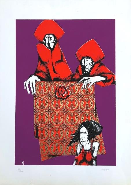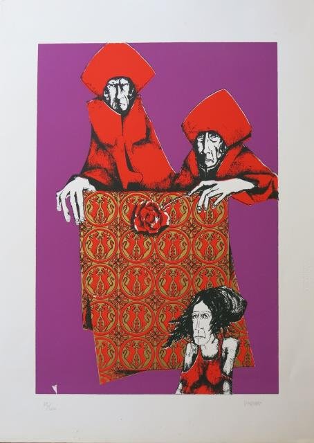 Serigrafia in colore, cm 50 x 70 circa. La Nuova Foglio, Grafica Club, Pollenza di Macerata. Serigrafia firmata a lapis in basso a destra e numerata 32 / 100 in basso a sinistra. Originale il modo del soggetto trattato e la grafica. Buono stato di conservazione. Amedeo Masacci (Cesena, 1930 – 1970). Compì gli studi di Belle Arti a Ravenna, Bologna e Modena ed ebbe le prime esperienze nell'ambito della scultura figurativa. Nel 1954 fu incaricato da Vincenzo Domeniconi di dirigere la sezione di ceramica artistica “Domeniconi Ceramiche” (attiva all'interno dello stabilimento di sua proprietà, per la produzione di laterizi e manufatti da giardino in terracotta), incarico che mantenne dal 1955 al 1958. Successivamente aprì uno studio d’arte a Cesena e nel 1962, sempre a Cesena, tenne una personale alla Galleria d'Arte “La Fontana”. Continuò a dedicarsi alla scultura e alla grafica partecipando a numerose esposizioni in Italia e all’estero, fra cui la Biennale Internazionale d’Arte di Venezia, la Triennale di Disegno di Milano e la Quadriennale d’Arte al Palazzo delle Esposizioni di Roma. Nel 2005 Cesena gli dedicò una mostra alla Galleria “Vicolo Cesuola” e nel 2007 fu installata nella città la scultura del maestro titolata “Ruota umana”.