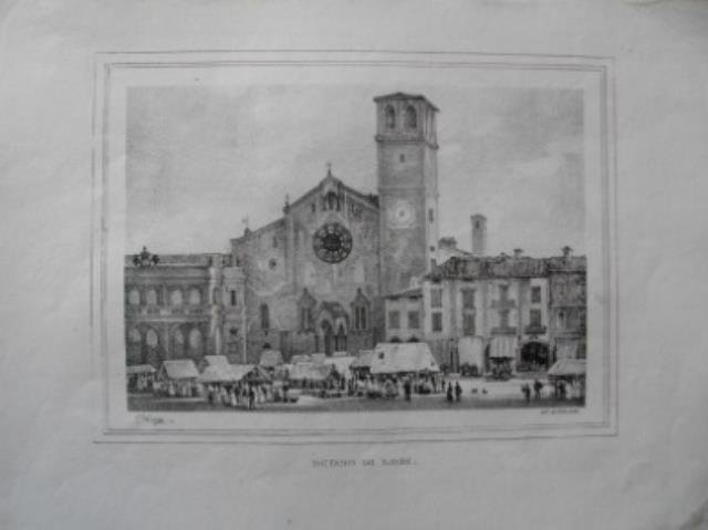 Da “Lombardia pittoresca”, 1836. Litografia di P. Bertotti, b/n, cm 16,6 x 22,5 (la parte figurata). Veduta animata del duomo e della piazza in giorno di mercato con personaggi e bancarelle. Buono stato.