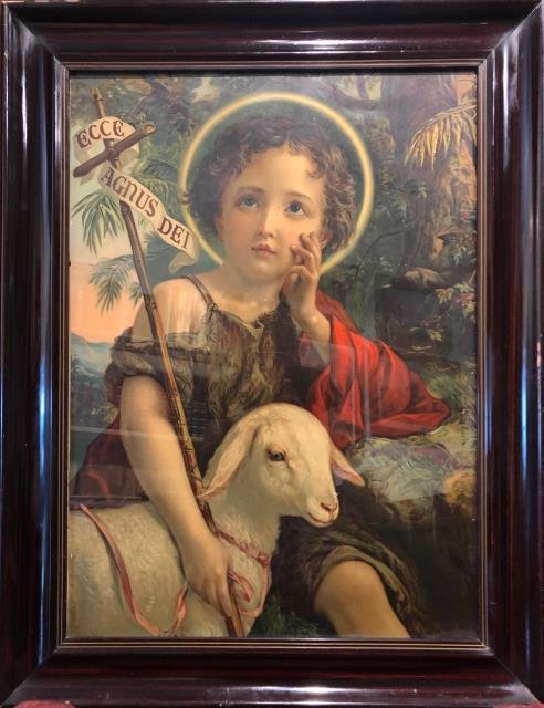 Cromolitografia originale, 1880 circa, cm 45 x 62. Bella immagine a grandi figure (inusuale per la tecnica e la dimensione dei soggetti rappresentati), spicca il mantello rosso e la dolcezza del bambino e dell'animale. Con bella cornice d'epoca (alcuni piccoli difetti) e vetro. La stampa è in ottimo stato di conservazione. .