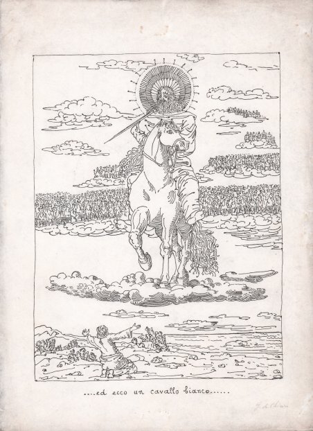 Litografia, edizione non numerata, firmata a matita in basso a destra dall’artista, opera inclusa nel volume 'Apocalisse' curato da R. Carrieri, Edizioni della Chimera, Milano. Bellissima prova, impressa su carta Japon, in buono stato di conservazione. Il fondatore della scuola metafisica, Giorgio de Chirico è conosciuto soprattutto per i suoi dipinti metafisici, prodotti tra il 1909 e il 1919. Queste rappresentazioni malinconiche influenzarono profondamente i surrealisti, tra cui André Breton, Salvador Dalí e René Magritte. Le opere dell'artista esplorano varie tematiche, tra cui quelle dell'alienazione, della nostalgia e del mito. ' De Chirico, in seguito, rifiutò il suo precedente stile metafisico e si interessò alle tecniche pittoriche tradizionali, prediligendo lo stile neoclassico e neobarocco influenzato da Raffaello, Luca Signorelli e Peter Paul Rubens. I surrealisti criticarono pubblicamente questo sviluppo antimoderno nel lavoro di de Chirico e l'artista alla fine pose fine alla sua associazione con il gruppo. L'Apocalisse [Edizioni della Chimera, Milano 1941] stampata da l’Officina d'Arte grafica A. Lucini & C. è una pubblicazione in-folio, illustrata da 20 tavole litografiche originali di Giorgio de Chirico, fuori testo e stampate su carta Japon (prima Edizione). Bibliografia G. Vastano, Giorgio De Chirico. Catalogo dell'opera grafica 1921-1969, pagina 181, figura 120. Lithograph, unnumbered edition, signed in pencil at lower right by the artist, work included in the volume 'Apocalisse' edited by R. Carrieri, Edizioni della Chimera, Milan. Beautiful proof, printed on Japan paper, in good condition. The founder of the metaphysical school, Giorgio de Chirico is best known for his metaphysical paintings, produced between 1909 and 1919. These melancholy depictions deeply influenced the Surrealists, including André Breton, Salvador Dalí and René Magritte. The artist's works explore various themes, including those of alienation, nostalgia and myth. ' De Chirico later rejected his earlier metaphysical style and became interested in traditional painting techniques, preferring the neoclassical and neo-Baroque style influenced by Raphael, Luca Signorelli and Peter Paul Rubens. The Surrealists publicly criticized this anti-modern development in de Chirico's work, and the artist eventually ended his association with the group. The Apocalisse [Edizioni della Chimera, Milan 1941] printed by l'Officina d'Arte grafica A. Lucini & C. is an in-folio publication, illustrated by 20 original lithographic plates by Giorgio de Chirico, out of text and printed “on Japon” paper (First Edition). Bibliography G. Vastano, Giorgio De Chirico. Catalog of graphic works 1921-1969, page 181, figure 120. Cfr.