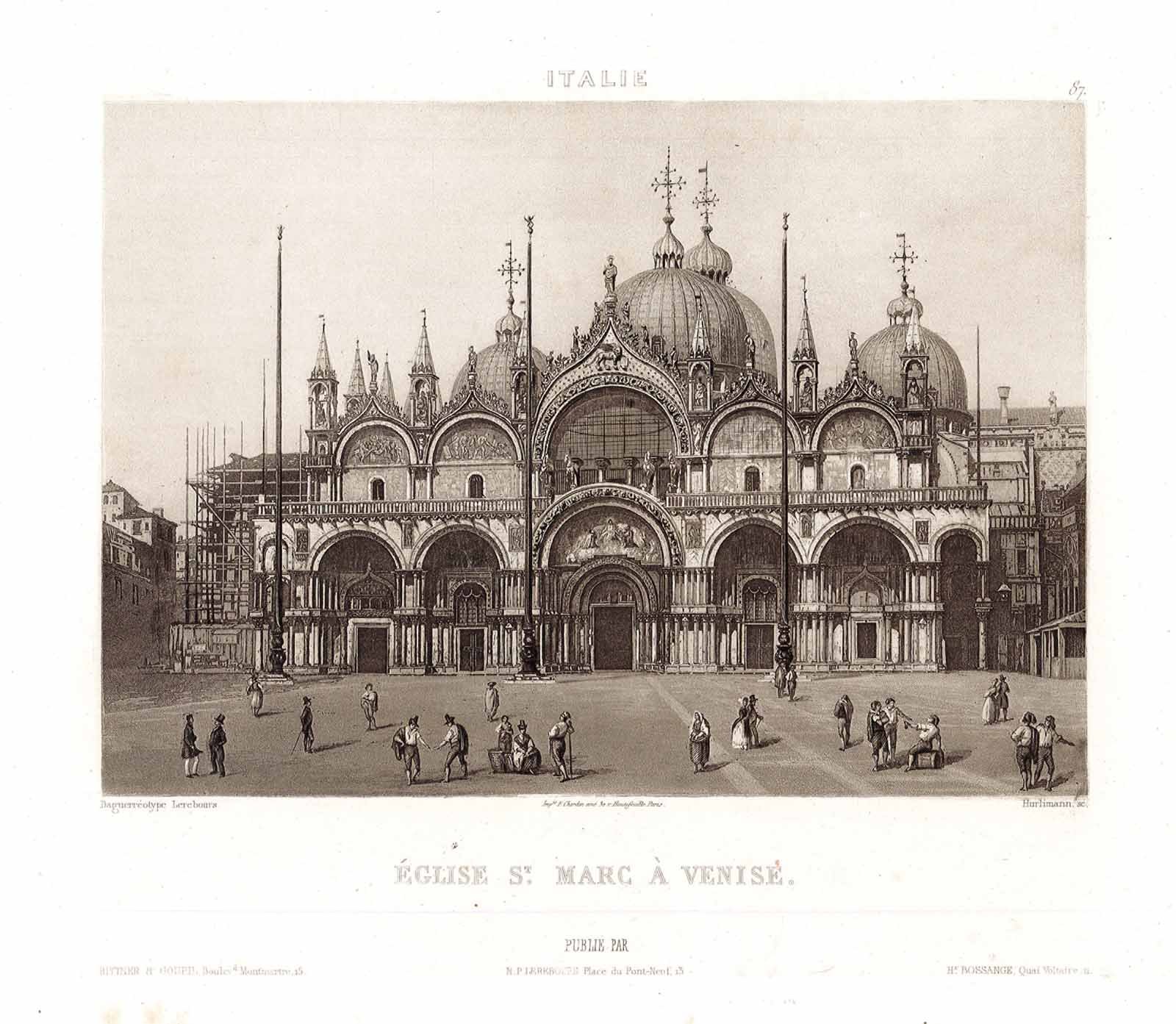 Stampa, antica ed originale, con veduta della chiesa di San Marco. Inserita nell'opera "Excursions photographiques. Vues et monuments les plus remarquables de l'univers.". Parigi 1863. Autore: Martens sculp. Luogo: Venezia. Anno: 1863. Tecnica: acquatinta. Dimensioni: 270x370 il foglio.
