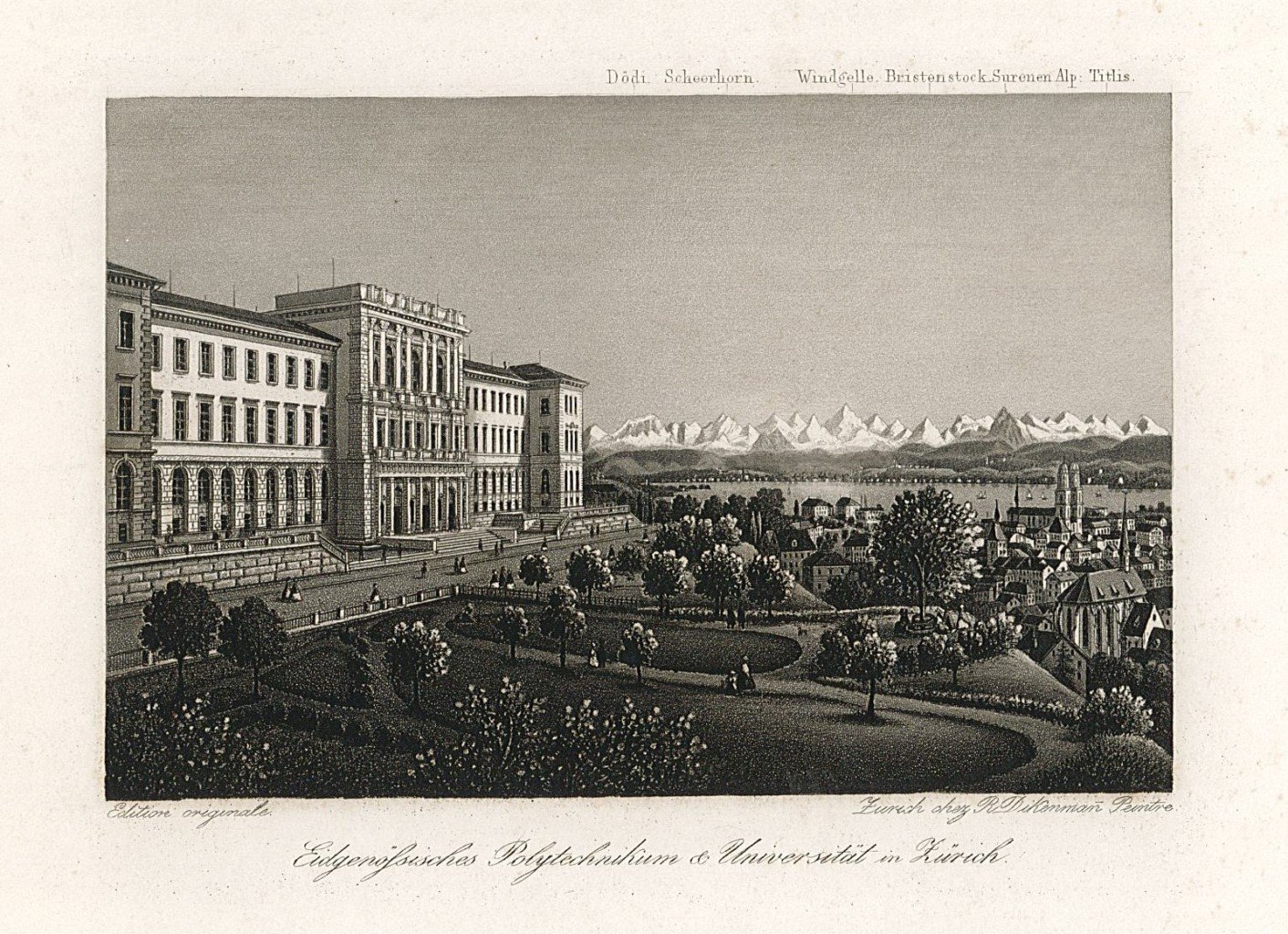Stampa, antica ed originale, raffigurante il palazzo dell'università in raffinata acquatinta. Inserita nell'opera "Souvenir de la Suisse" edita a Zurigo. Autore: Dikenmann Rudolf dis. (1793 Zürich 1883). Luogo: Zurigo. Anno: 1860 ca. Tecnica: acquatinta. Dimensioni: 74x112 mm