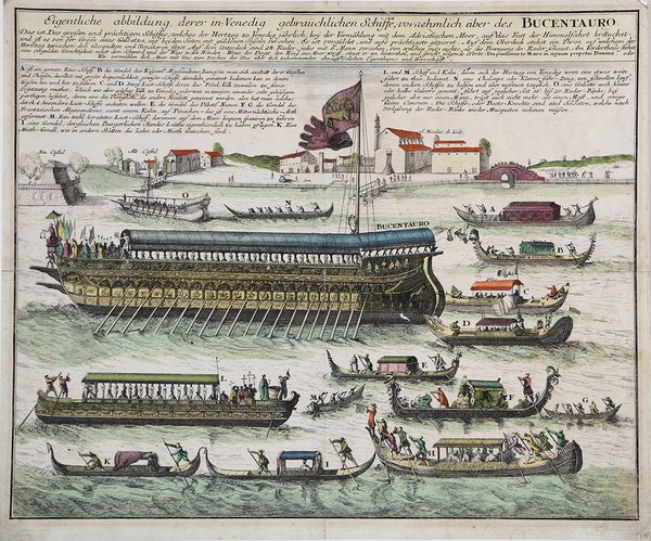 Incisione su rame di Christoph Weigel tratta dal Comfortable School and Travel Atlas di Johann David Köhler, del 1718. Al centro dell'illustrazione troviamo il Bucintoro, la galea di stato dei Dogi di Venezia, sulla quale si imbarcavano ogni anno nel giorno dell'Ascensione per celebrare il rito veneziano dello sposalizio con il mare. Tutto intorno sono rappresentate una serie di imbarcazioni più piccole. In alto si trovano titolo e legenda, oltre a piccoli scorci dedicati ad alcuni monumenti della città. ' Incisione in rame, coloritura coeva, in ottimo stato di conservazione. Copper engraving by Christoph Weigel from the Comfortable School and Travel Atlas by Johann David Köhler, 1718. At the center of the illustration we find the Bucintoro, the official boat of the Doges of Venice, used every year on Ascension Day to celebrate the Venetian rite of marriage with the sea. All around a series of smaller boats At the top there are title and legend. ' Copperplate, with fine original colour, very good condition. Cfr.