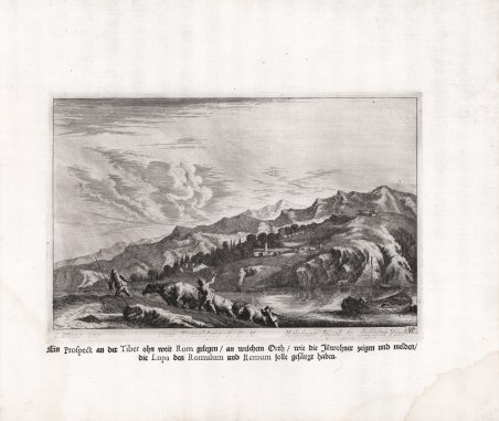 Veduta panoramica di Orte e del Tevere, incisa da Melchior Küsel da un disegno di Johann Wilhelm Baur. Acquaforte, 1670 circa, firmata sulla lastra in basso a destra. Bella impressione su carta vergata coeva, ottimo stato di conservazione. L'opera fa parte delle suite di vedute paesaggistiche dell'Italia, eseguite da Johann Wilhelm Baur negli anni Trenta del Seicento e incise da Melchior Küsel (1636-1683). Baur nacque a Strasburgo nel 1607 e fu formato da Friedrich Brentel come disegnatore e pittore di miniature. Verso il 1630 si recò in Italia, vivendo prima a Napoli e poi a Roma sotto il patrocinio delle famiglie Colonna e Orsini. Nel 1637 tornò a nord, passando per Venezia, a Vienna, dove morì nel 1642. Durante questo soggiorno Baur realizzò centinaia di disegni, alcuni molto rifiniti e destinati a essere presentati ai suoi nobili committenti, altri a essere utilizzati per le stampe. L'incisore Melchior Küsel acquistò circa duecento disegni di Baur dopo la morte dell'artista, tra cui scene della vita, dei miracoli e della Passione di Gesù Cristo, mitologia classica, vedute dei porti, delle ville e dei giardini di Napoli, Roma e Venezia, il paesaggio intorno a Livorno, Ancona, Lucca, Firenze, il Friuli e la penisola istriana. Nel 1670 Küsel pubblicò ad Augusta l'Iconographia, dedicata all'imperatore Leopoldo e comprendente 148 incisioni su disegno di Baur, di cui sessantotto erano vedute italiane e il resto soggetti religiosi o storici. Nuove edizioni dell'Iconographia apparvero sotto l'imprint di Küsel nel 1671, 1672 e 1682, e sotto quella del genero Johann Ulrich Kraus nel 1686 e nel 1702. Bibliografia F.W.H. Hollstein, German etchings, engravings & woodcuts 1400–1700, XX (Amsterdam 1977), p.111, nos.476–490. Panoramic view of Orte and the Tiber, engraved by Melchior Küsel after Johann Wilhelm Baur. Etching, circa 1670, signed on plate at lower right. A fine impression on contemporary laid paper, very good condition. The work is part of the suites of landscape views of Italy, executed by Johann Wilhelm Baur in the 1630s, and engraved a generation later by Melchior Küsel (1636–1683). Baur was born at Strasbourg in 1607 and was trained by Friedrich Brentel as a draughtsman and miniature painter. About 1630, he went to Italy, living first at Naples, then in Rome under the patronage of the Colonna and Orsini families. In 1637, he returned north via Venice to Vienna, where he died in 1642. Baur made hundreds of drawings during this sojourn, some highly finished and intended for presentation to his noble patrons, others to be used for prints. The engraver Melchior Küsel acquired about two hundred of Baur’s drawings after the death of the artist, including scenes of the life, miracles and Passion of Jesus Christ, classical mythology, views of the harbours, villas, and gardens of Naples, Rome, and Venice, the landscape around Livorno, Ancona, Lucca, Florence, and of the Friuli and Istrian peninsula. In 1670 Küsel published at Augsburg the Iconographia, dedicated to the emperor Leopold, and comprising 148 engravings after Baur’s designs of which sixty-eight were Italian views and the rest religious or historical subjects. New editions of the Iconographia appeared under Küsel’s imprint in 1671, 1672, and 1682, and under the imprint of his son-in-law Johann Ulrich Kraus in 1686 and 1702. Bibliografia F.W.H. Hollstein, German etchings, engravings & woodcuts 1400–1700, XX (Amsterdam 1977), p.111, nos.476–490. Cfr.