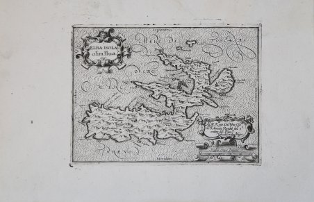 Carta geografica tratta dal ' L’Italia ' a cura di Fabio Magini, edito a Bologna nel 1620, tre anni dopo la prematura morte del padre. Composto da un breve testo descrittivo di sole 24 carte, l’opera è corredata di 61 carte geografiche della penisola, e costituisce il primo esempio di atlante italiano. L’opera è per intero di mano del Magini, che iniziò la realizzazione delle carte nel 1594 circa, dando alla luce per prima nel 1595 la carta del territorio di Bologna. Tutte le carte vennero alle stampe quindi prima del 1620, nelle loro stesure provvisorie, successivamente corrette ed aggiornate per l’edizione definitiva. Per la realizzazione delle lastre il Magini si servì di due dei più famosi intagliatori dell’epoca: il belga Arnoldo Arnoldi e l’inglese Benjamin Wright. La carta dell'Isola d'Elba non presenta nessuna affinità con quelle a stampa antecedenti. ' Probabilmente deriva direttamente dalla pittura di Egnatio Danti nella Galleria Vaticana, rispetto alla quale presenta solo alcuni toponimi in meno, forse è tratta dalla stessa fonte che ispirò il Danti, oggi perduta. ' Nel cartiglio in alto a sinistra il titolo ' ELBA ISOLA olim Ilva. ' In basso a destra: nel cartiglio la dedica ' Al’ M. R.do ' mio S.r ' et P[ad]rone Oss.mo ' il P. F. Antonio Roncho del 3.o ' ordine di S. Franc.o. Fabio di Gio. Ant. Magini. ' e la scala grafica ' Miglia cinque Italiane ' (5 miglia pari a mm 60). Orientazione nei quattro lati al centro con il nome dei punti cardinali ' Septentrio, Meridies, Oriens, Occidens, ' il nord in alto. Carta priva di graduazione ai margini. Incisione in rame, in eccellente stato di conservazione. Map taken from ' L'Italia ' edited by Fabio Magini, published in Bologna in 1620, three years after the untimely death of his father. Composed of a short descriptive text of only 24 pages, the work is accompanied by 61 maps of the peninsula, and is the first example of an Italian atlas. The work is entirely by the hand of Giovanni Antonio Magini, who began the realization of the maps in 1594 or so; the first dated map (1595) the map of the territory of Bologna. All the maps were printed before 1620, in their provisional drafts, later corrected and updated for the final edition. For the realization of the plates Magini used two of the most famous engravers of the time: the Belgian Arnoldo Arnoldi and the English Benjamin Wright. Copperplate, in good condition. Map of the Island of Elba which has no affinity with those printed before.Probably derives directly from the painting of Egnatio Danti in the Vatican Gallery, with respect to which it has only a few toponyms in less, perhaps it is taken from the same source that inspired the Danti, now lost. Nel cartiglio in alto a sinistra il titolo ' ELBA ISOLA olim Ilva. ' In basso a destra: nel cartiglio la dedica ' Al’ M. R.do ' mio S.r ' et P[ad]rone Oss.mo ' il P. F. Antonio Roncho del 3.o ' ordine di S. Franc.o. Fabio di Gio. Ant. Magini. ' e la scala grafica ' Miglia cinque Italiane ' (5 miglia pari a mm 60). In excellent condition. Cfr.