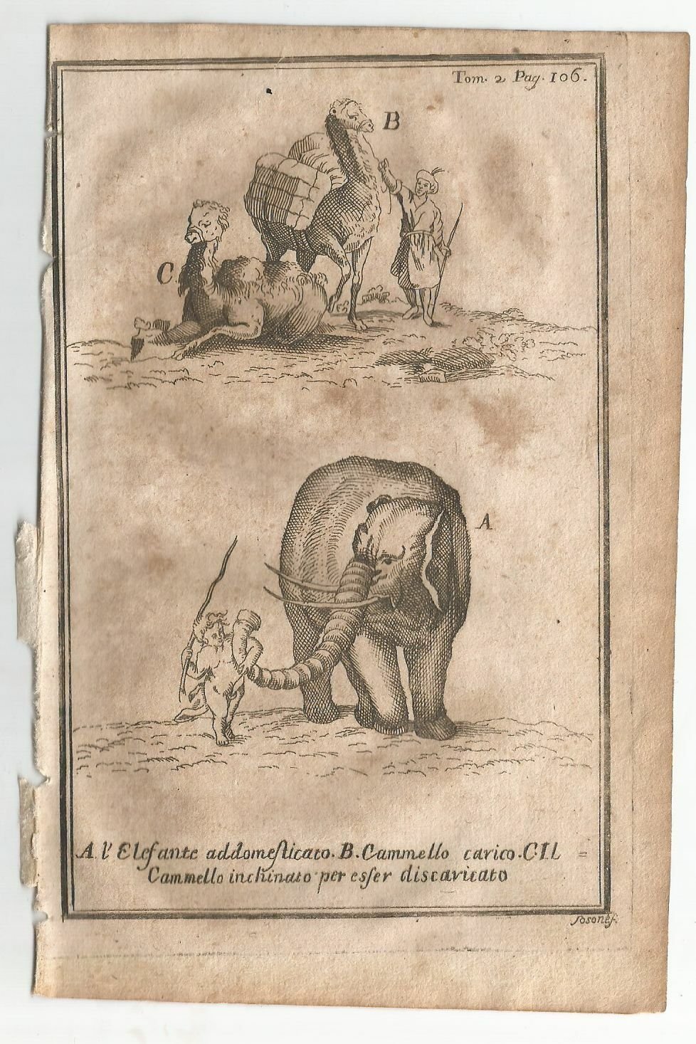 ELEFANTE CAMMELLO. INCISIONE ORIGINALE IN RAME DEL 1740 OVVERO DI OLTRE 280 ANNI FA! TRATTA DALL'OPERA "LO SPETTACOLO DELLA NATURA ESPOSTO IN VARJ TRATTATI" EDITA DA FRANCESCO RICCIARDO IMPRESSORE IN VENEZIA E IN NAPOLI. L'INCISIONE E' IN CONDIZIONI MOLTO BUONE, CONSIDERATI I SUOI 280 ANNI (QUALCHE FIORITURA E BRUNITURE ALLA PIEGA VERTICALE) E' DI DIMENSIONI AMPIE (LA PARTE A STAMPA E' DI 16 X 9,5 CM ED E' MOLTO BEN DISEGNATA.