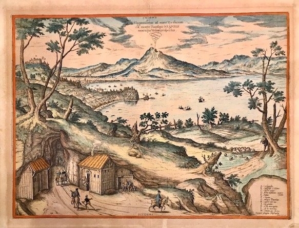Incisione originale su rame (cm. 49x36 più ampi margini bianchi) dalla celebre e monumentale opera ‘Civitates Orbis Terrarum’ pubblicata tra il 1572 ed il 1617. Splendida coloritura coeva. Lieve uniforme brunitura e due minuscoli fori restaurati, altrimenti esemplare in ottimo stato di conservazione. Affascinante veduta dall’alto di Posillipo attraverso la baia fino al Vesuvio (da un dipinto di Georg Hoefnagel del 1578).