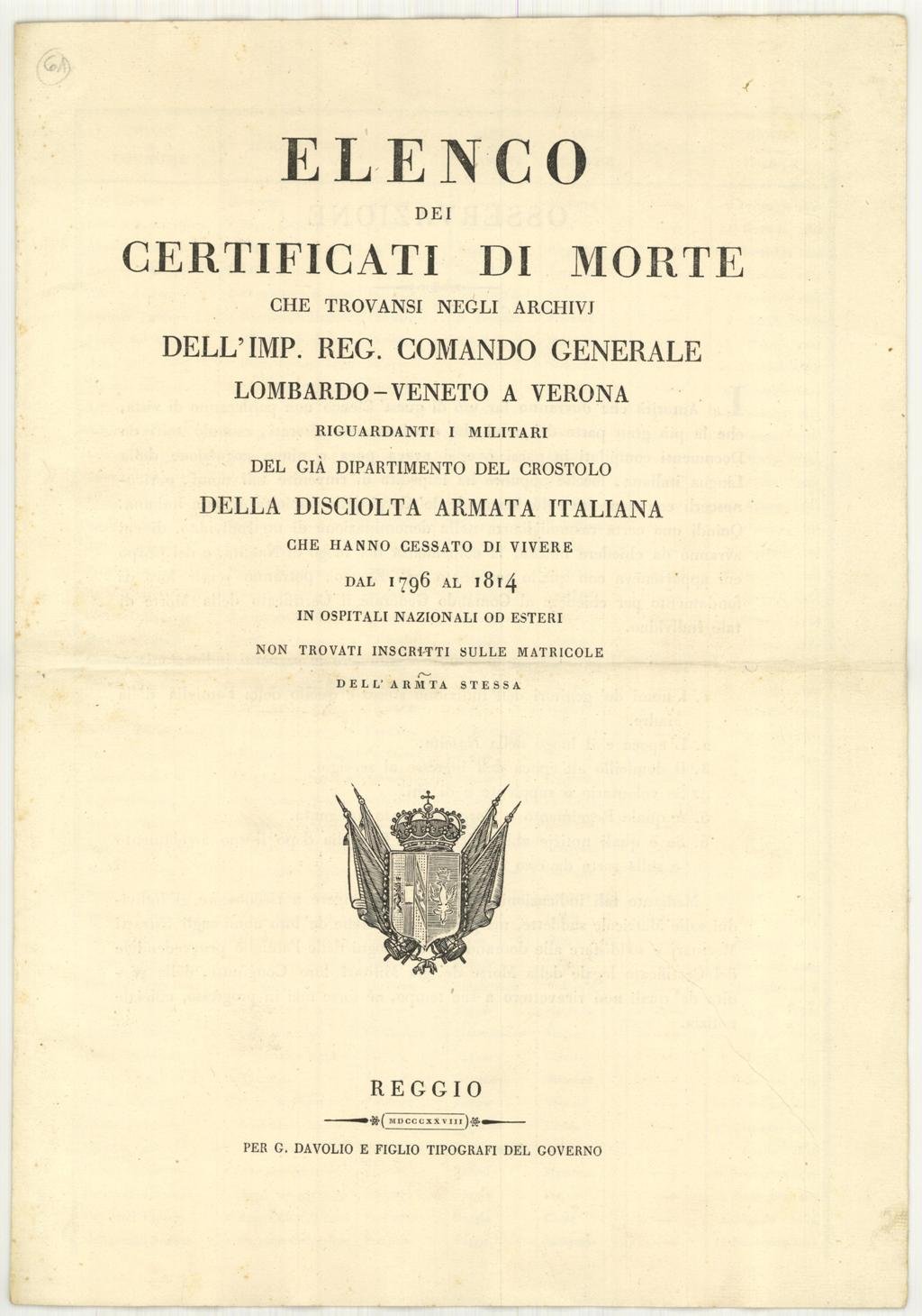 Documento, antico ed originale proveniente da importante collezione reggiana, de "Elenco dei certificati di morte che trovansi negli archivi dell’Imp. Reg. Comando Generale Lombardo-Veneto a Verona riguardanti i militari del già dipartimento del Crostolo della disciolta Armata Italiana che hanno cessato di vivere dal 1796 al 1814 in ospitali nazionali od esteri non trovati inscritti sulle matricole dell’arma stessa”. 181 nominativi in 4 tabelle
