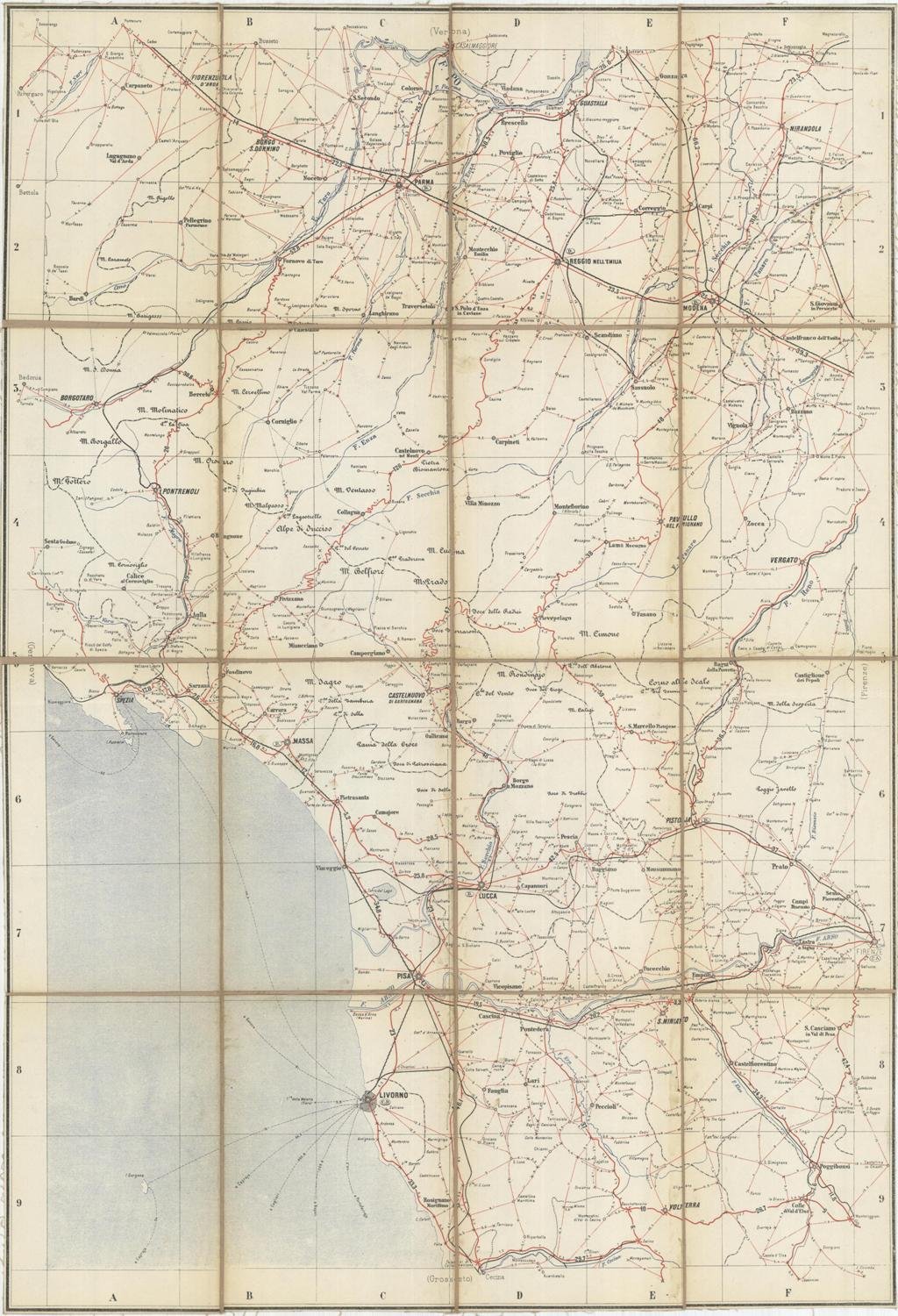 Carta geografica, antica ed originale, riguardante l'Emilia e l'alta Toscana in particolare le provincie di Livorno, Pisa, Lucca, Pistoia Massa, Lunigiana, Parma, Reggio Emilia e Modena. Nei segni convenzionali vengono evidenziati: Itinerari generali., Distanze riferentisi a tronchi diversi, Distanze approssimative per strade mulattiere, Ferrovie, Ferrovie a scartamento ridotto, Passaggi sulle acque. La carta si presenta editorialmente telata a stacchi