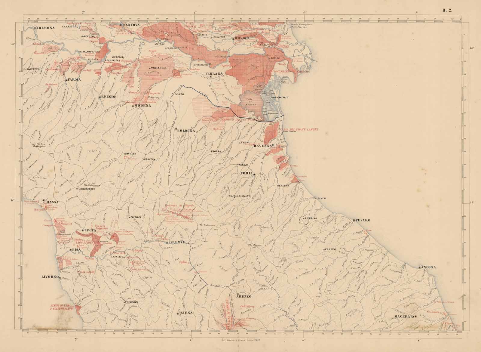 Particolare carta geografica, antica ed originale, dell'Emilia Romagna, Toscana, Marche con evidenziate, in colore rosso, le località bonificate, località in corso di bonificazione, località bonificabili, regione igenicamente influenzata,. Tratta dalla "Carta delle Bonificazioni italiane, Scala di 1 a 500.000" edita in Roma nel 1878. Piega centrale editoriale