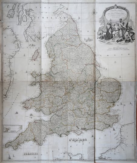 Dettagliata mappa murale di Inghilterra e Galles, con l'indicazione precisa di strade, città, distanze, centri urbani ecc, incisa da John Rocque - prolifico cartografo inglese del XVIII sec.Questa mappa è pubblicata nell'atlante curato da Thomas Kitchin A General Atlas Describing the Whole Universe, pubblicato a Lodra da Robert Sayer nel 1790.Incisione su rame, impressa su quattro fogli grandi uniti insieme, coloritura coeva dei confini. In ottimo stato di conservazione. A very detailed map of England and Wales showing roads by type, cities, distances, market towns, latitude and longitude of important places, villages with and without stages, distances from London, and more. John Rocque was a prolific map maker in London during the 18th century. This map as well as his two sheet map of Ireland appeared in Thomas Kitchin's A General Atlas Describing the Whole Universe of 1790.Shows forested areas, classified roads with distances, etc. Relief shown pictorially. Includes inset map of the Isles of Scilly and drawings of ships.Engraved map printed on 4 sheets comprising. Counties in outline color. In very good contion. Cfr.