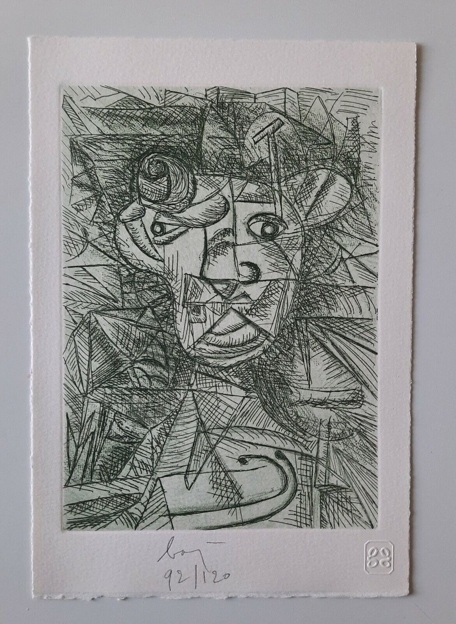 In 4°, pag. 17, legatura editoriale, copertina illustrata, custodia editoriale cartonata, incisione all'acquaforte numerata e firmata dall'artista.