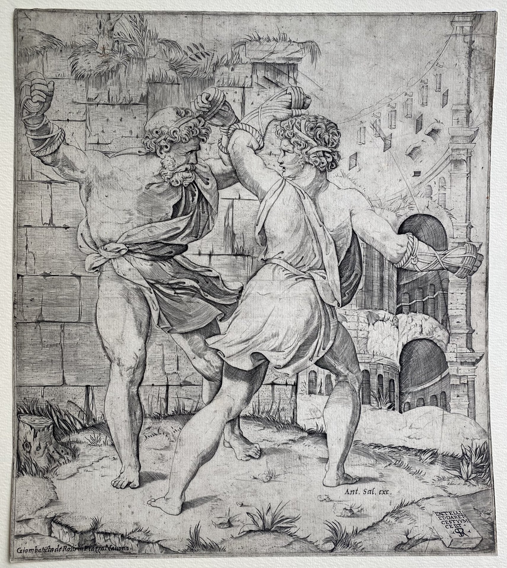 L'incisione raffigura l'episodio descritto nel Libro V dell'Eneide da Virgilio; il combattimento tra il giovane troiano Darete con l'anziano siculo Entello durante i giochi in memoria di Anchise. La scena si svolge davanti al Colosseo, e tale ambientazione è stata messa in relazione da Quorrier con. lo schizzo del Codex Escurialensis (Egger, 1905, 24). Pathos e dinamicità si costruiscono su giochi chiaroscurali e sulla plasticità delle figure. Secondo il Bartsh questo soggetto deriva da un'invenzione di Raffaello ma più probabilmente il soggetto è tratto da un disegno di Giulio Romano (Massari 1985) che riprende un rilievo del Museo Lateranense, poi trasportato al Museo Pio-Clementino ora Museo Gregoriano Profano (inv. 9502, 9503). Secondo Oberhuber deriverebbe da un disegno di nudo di Baccio Bandinelli. In basso a destra, nella tavoletta, inciso: ENTELLI / ET . DARET. / CESTVVM / CERT./ SR. A più in alto l'indirizzo di Antonio Salamanca e a sinistra inciso l'indirizzo di Giambattista de Rossi (1601-1678) che contraddistingue il III stato. Tiratura databile alla metà del XVII secolo. Il primo stato è privo di indirizzi, il II reca l'indirizzo di Antonio Salamanca.