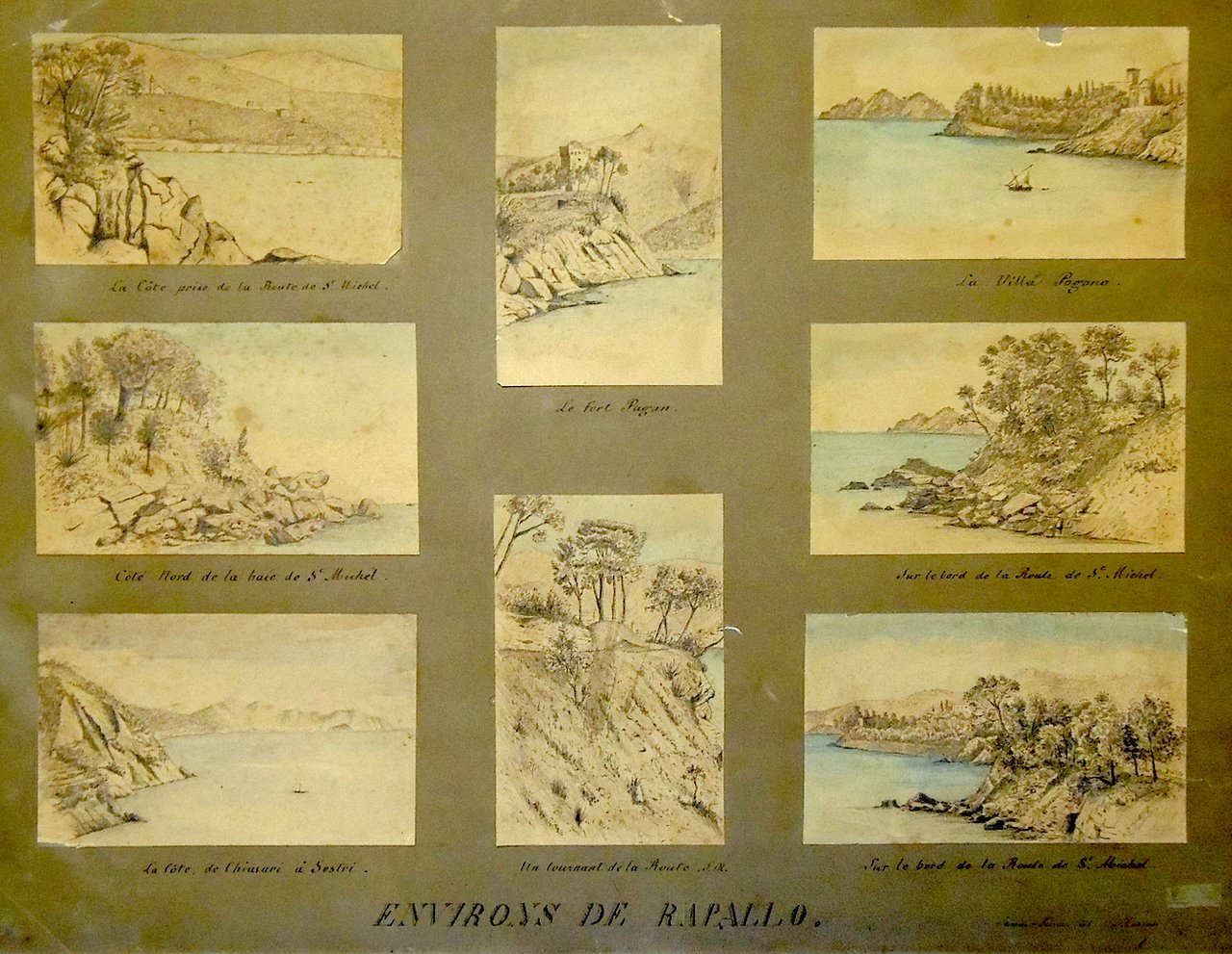 Serie di 8 disegni a lapis con leggera parziale coloritura ad acquerello verde, ognuno misura mm 110x180, montati su foglio originale di supporto che riporta il titolo generale e i titoli die singoli disegni: 1-La côte prise de la route de St. Michel 2- Côté nord de la baie de St. Michel. 3- La côte, de Chiavari à Sestri 4- Le Fort Pagan 5-Un tournant de la route S.M. 6-La Villa Pagana 7-Sur le bord de la route de St. Michel 8-Sur le bord de la Route de st.Abiehol. Complessivamente ben conservato, un disegno (6) con mancanza in alto, uno strappo nel foglio di supporto in alto. <BR>