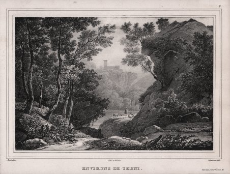 Veduta tratta da ' Vues d Italie et de Sicile, dessinées d après nature par A. E. Michallon, Ancien Pensionnaire du Roi a l'École de Rome; et litographiées par M M. Villeneuve, Deroi et Renoux, Paris, Lami - Denozan, 1827.Si tratta di una raccolta di 20 tavole non numerate, finemente litografate, impresse su papier du Chine applicata su carta e protette da fogli di velina; sotto la parte figurata di ciascuna tavola, il titolo, nonché le indicazioni degli artisti e dello stabilimento litografico Villain.Litografia, in ottimo stato di conservazione. View from A Pictoresque Tour of Italy, from drawings made in 1816-17 by James Hakewill, published in London in 1820. This is a collection of 20 unnumbered plates, finely lithographed, printed on papier du Chine applied to paper and protected by tissue paper sheets; below the illustrated part of each plate, the title, as well as indications of the artists and the Villain lithographic factory. ' Copper engraving, finely hand-colored, in excellent condition. Cfr.