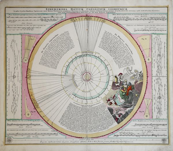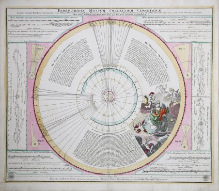 Tavola astronomica raffigurante il moto dei pianeti e la teoria di Hook per il calcolo della distanza tra il Sole e Sirio. Mostra la spiegazione geometrica dei moti irregolari apparenti dei pianeti esterni fino ad allora conosciuti (Marte, Giove e Saturno), seguendo la teoria Copernicana Eliocentrica. Sono descritte le posizioni apparenti dei Pianeti Venere, Mercurio, Marte, Giove e Saturno negli anni 1708 e 1709. Nell'illustrazione è rappresentata l'allegoria del Sistema Solare.Si tratta della carta numero 8 dell’Atlas Coelestis (1742) di Johann Gabriel Doppelmaier che il professore di matematica all’Aegidien Gymnasium di Norimberga, rifacendosi in parte al lavoro di Pardies, redasse intorno al 1720 per conto dell’officina tipografica fondata nella stessa città nel 1702 dal cartografo Johann Baptist Homann.Incisione in rame, coloritura coeva, in ottime condizioni. Copper engraved map of the planetary motion as per observations of 1708 and 1709 by J. G. Doppelmaier. The left hand lunar map, composed by Hevelius, is a considered a foundational map in the science of Selenography – or lunar cartography. This map first appeared in Hevelius' 1647 work Selenographia which laid the groundwork for most subsequent lunar cartographic studies. Here the moon is presented as it can never be seen from Earth, at a greater than 360 degrees and with all visible features given equal weight. In this map Hevelius also establishes the convention of mapping the lunar surface as if illuminated from a single source – in this case morning light. The naming conventions he set forth, which associate lunar features with terrestrial locations such as 'Asia Minor,' 'Persia,' 'Sicilia,' etcetera were popular until the middle of the 18th century when Riccioli's nomenclature took precedence. The Riccioli map, on the right, is more properly known as the Riccioli-Grimaldi map, for fellow Jesuit Francesco Grimaldi with whom Riccioli composed the chart. This map first appeared in Riccioli and Grimaldi's 1651 Almagestum Novum. This was a significant lunar chart and offered an entirely new nomenclature which, for the most part, is still in use today. Curiously, though Riccioli, as a devout Jesuit, composed several treatises denouncing Copernican theory, he chose to name one of the Moon's most notable features after the astronomer – perhaps suggesting that he was a secret Copernicus sympathizer. Other well-known lunar features named by Riccioli include the Sea of Tranquility where Apollo 11 landed and where Neil Armstrong became the first human to set foot on the moon's surface.The upper left and right hand quadrants feature decorative allegorical cartouche work that include images of angelic children looking through a telescope and a representation of the ancient Greek Moon goddess Selene. Additional mini-maps show the moon in various phases of its monthly cycle. Below the map proper extensive Latin text discusses Selenography. Also showing the Hooke's calculation of the distance between the Sun and Sirius. This is map number 8 of the Atlas Coelestis (1742) by Johann Gabriel Doppelmaier that the professor of mathematics at the Aegidien Gymnasium in Nuremberg, referring in part to the work of Pardies, wrote around 1720 on behalf of the printing house founded in the same city in 1702 by cartographer Johann Baptist Homann. Cfr.