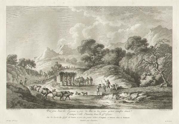 Acquaforte molto bella e decorativa f. 34 x 24 raffigurante viandanti ed una carovana attorno ad una fontana. Paris, Saint-Non