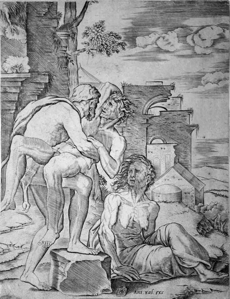 Preziosa incisione in rame di Agostino Veneziano su disegno di Raffaello Sanzio (Giulio Romano ?), di mm. 223 x 173, sotto passepartout. Cfr. Raphael invenit, p. 248-249 e illustrazioni p. 815 - Benezit,X, p. 44.Esemplare ritoccato (terzo stato) con l'aggiunta dell'indirizzo del Salamanca. Ben conservato.